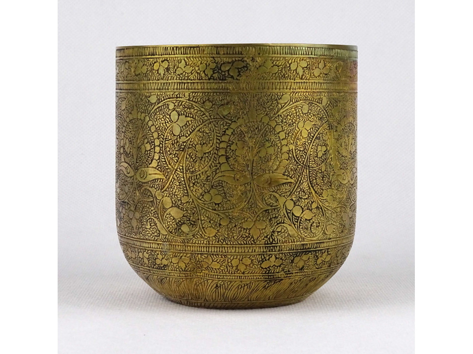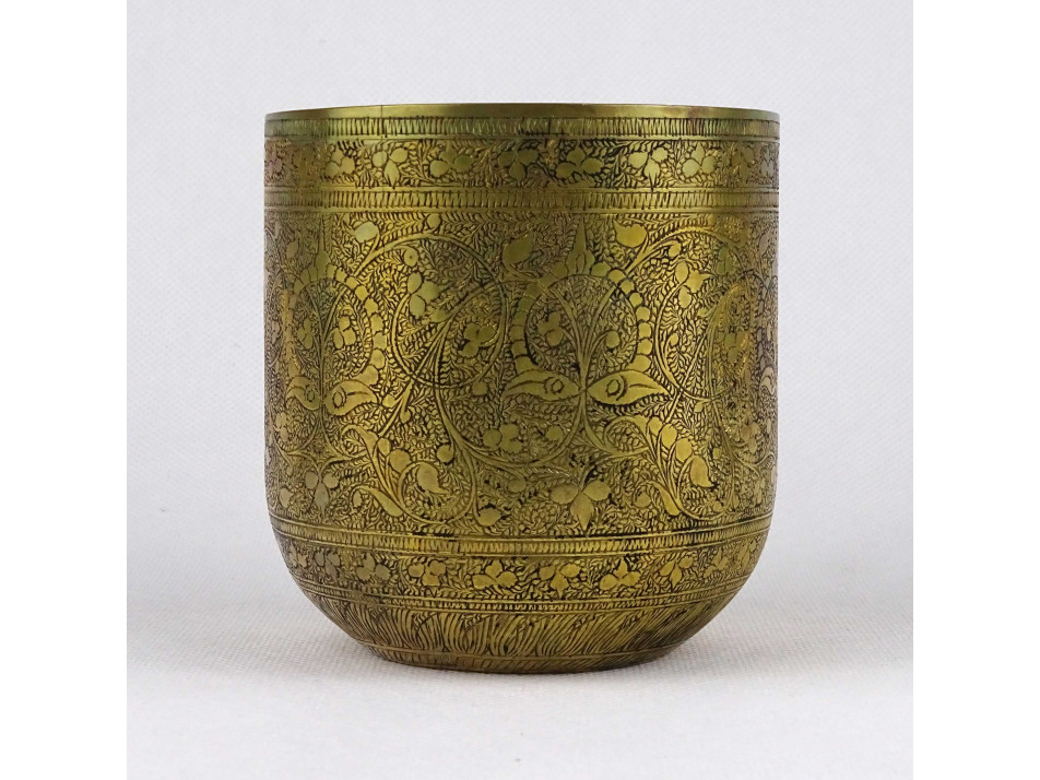Főoldal » Fémműves termékek » Kaspó » Régi, keleti, indiai, vésett mintákkal díszített, réz kaspó, virágtartó 10.3 x 9.7 cm