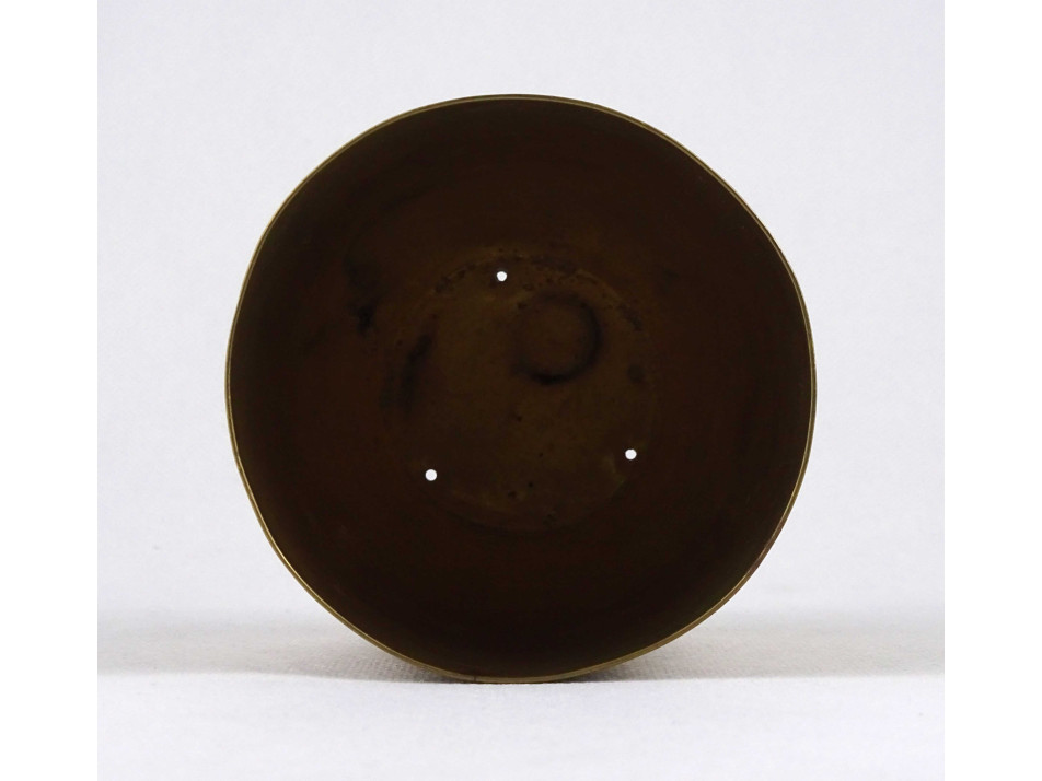 Régi, szép állapotú, jelzetlen, teljes felületén vésett, keleti növényi ornamentikával díszített, rézből készült virágkaspó, virágtartó. A talpán három apró furat található.