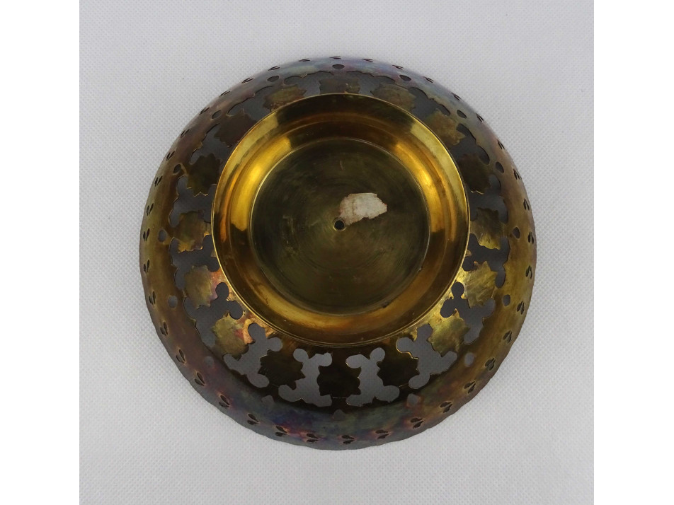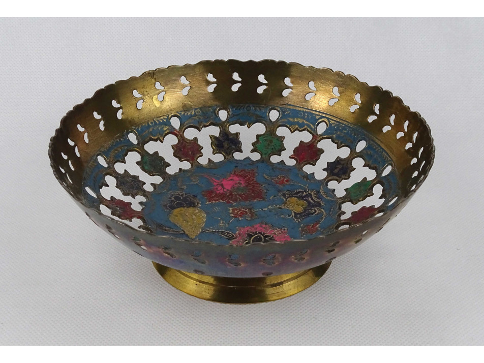 Régi, áttört oldalú, virág motívumokkal gazdagon díszített, festett, keleti, indiai réz talpas tál.