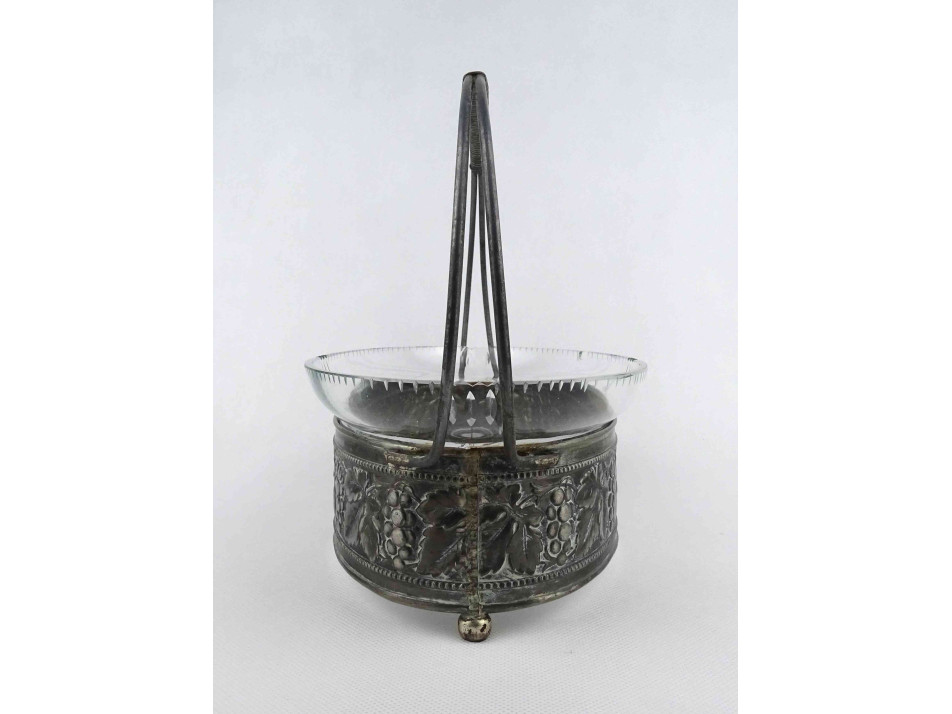Régi bécsi szőlőleveles csiszolt üvegbetétes gyümölcskosár kínáló tál