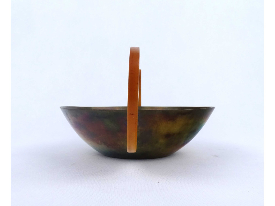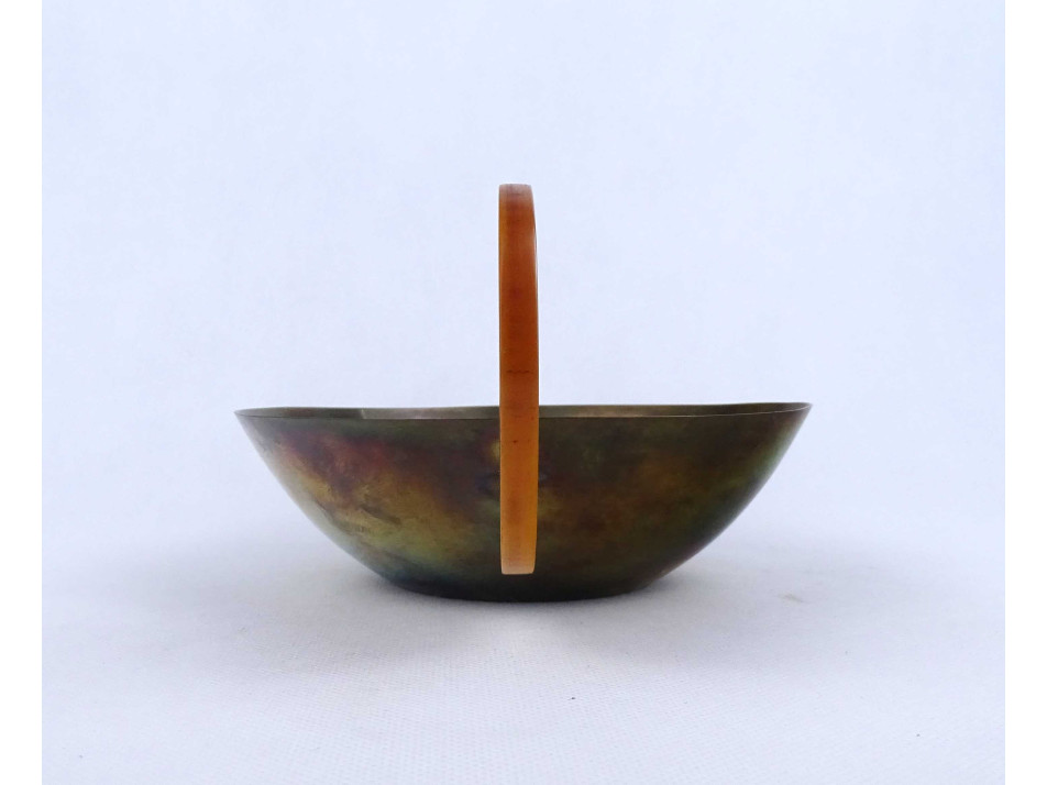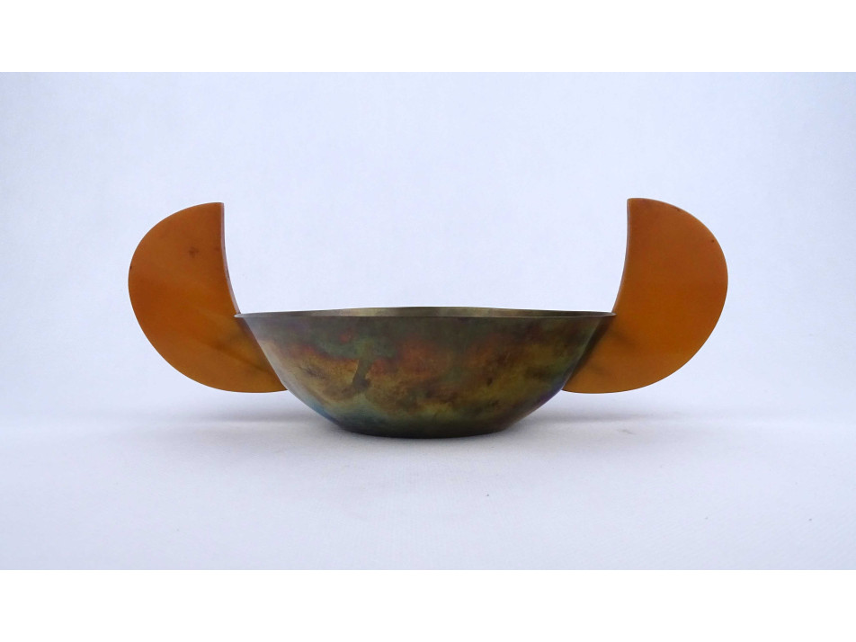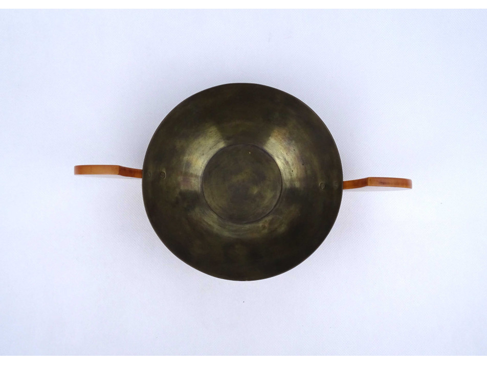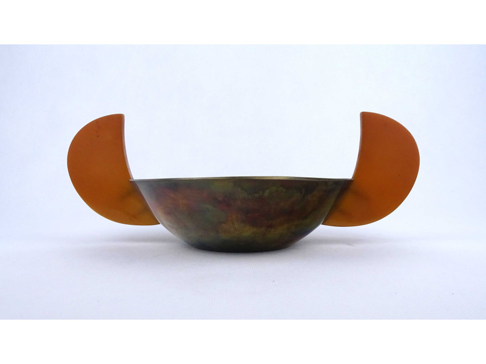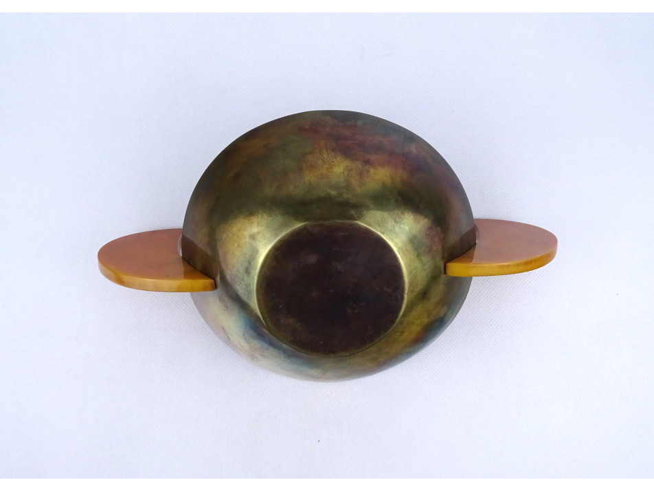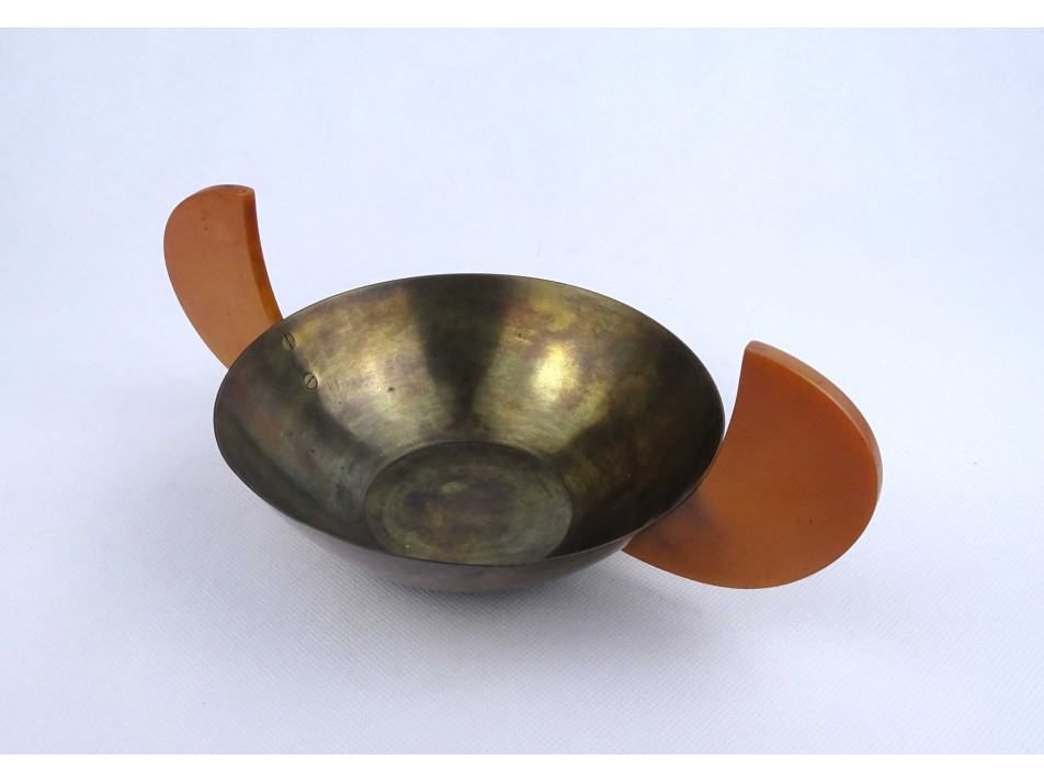 Antik formatervezett art deco sárgaréz tál borostyán hatású fülekkel 27.5 cm