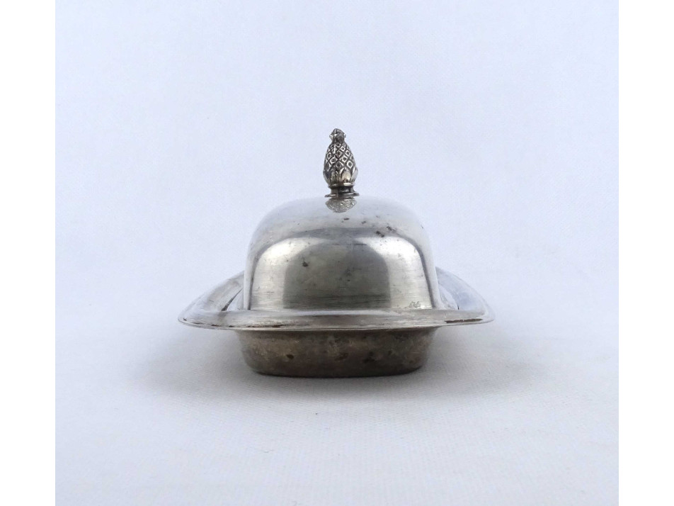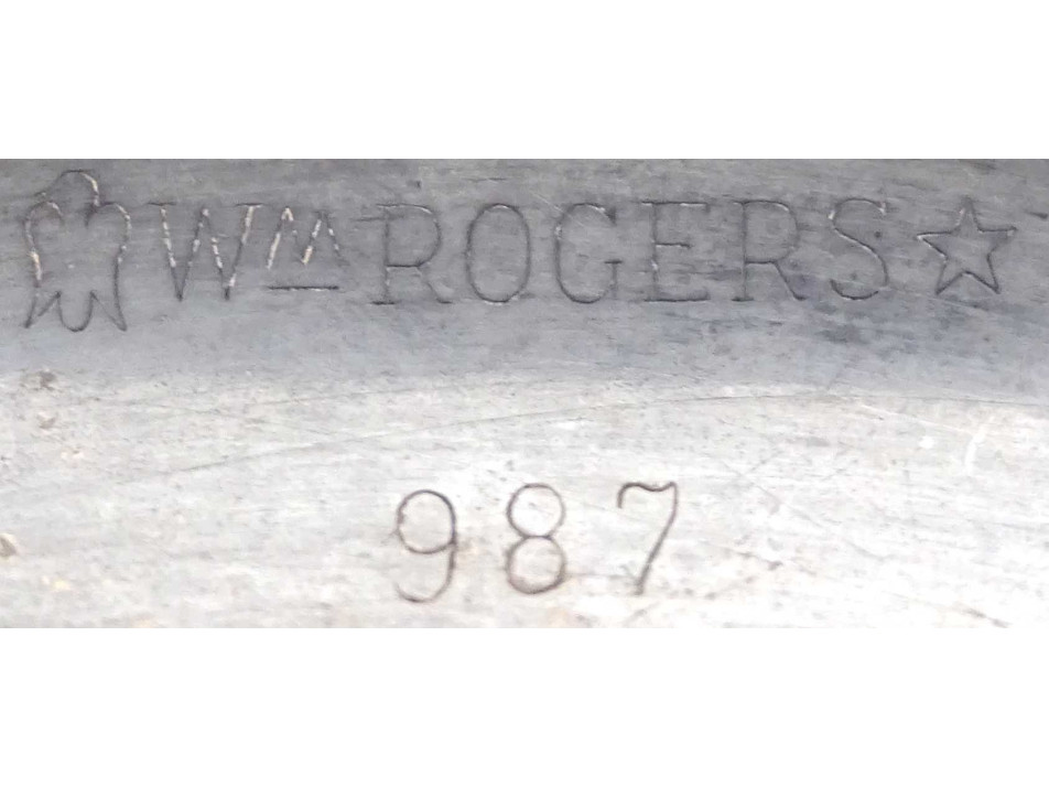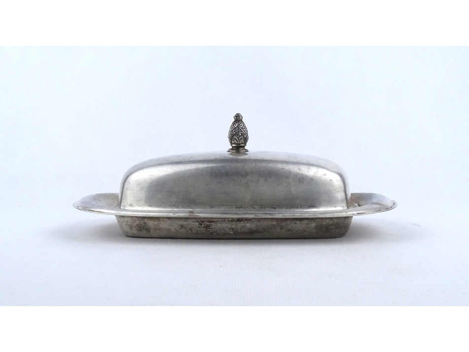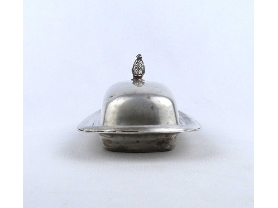 Régi, szép állapotú, fedeles, ezüstözött fém asztali vajtartó. Alsó részén az ezüstözés kopottas. Pereme alján jelzés: WM ROGERS 987