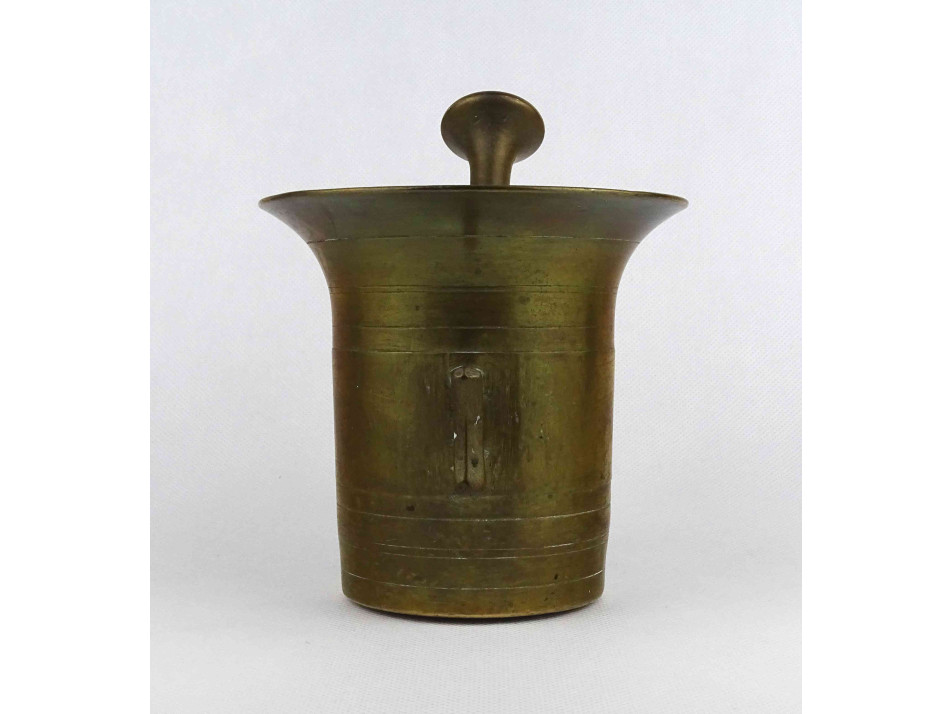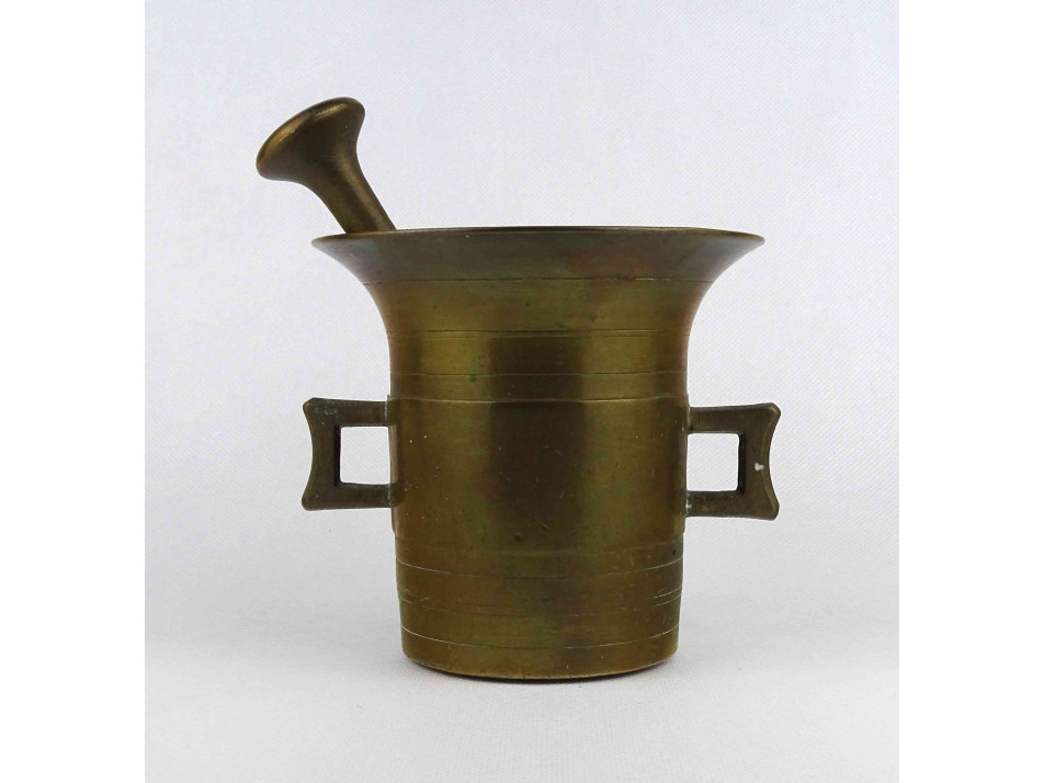 Antik, patinás szögletes fülű réz mozsár törővel.