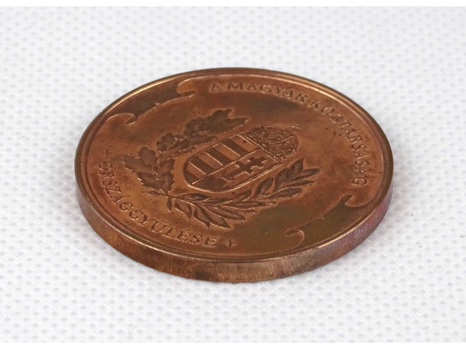Műanyag tokjában található, kétoldalas, kis méretű bronzplakett. Egyik oldalona Parlament látképe és felirat: BUDAPEST PARLAMENT Másik oldalon a Magyar Köztársaság címere és felirat: A MAGYAR KÖZTÁRSASÁG ORSZÁGGYŰLÉSE