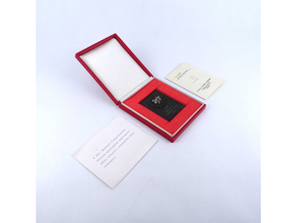 Eredeti díszdobozában lévő egyoldalas emlékplakett adományozó levéllel és egy állandó névnap-naptárral 1967-ből.