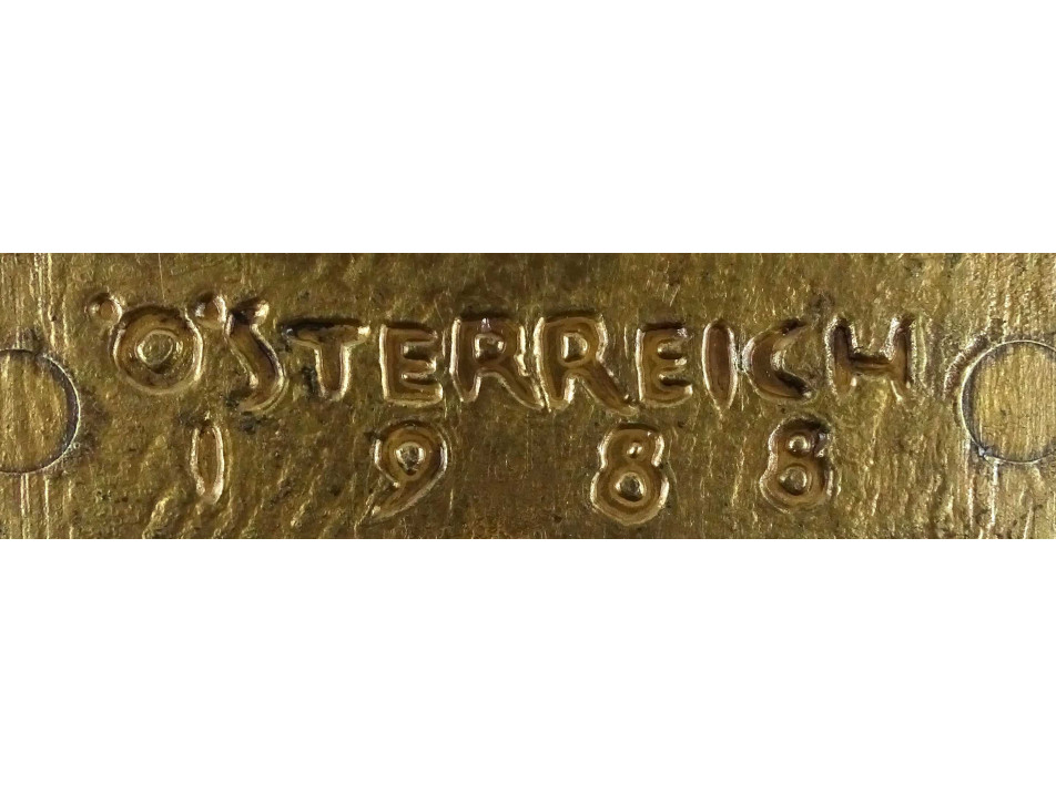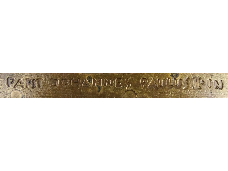 Régi, jelzett Erwin Huber, bronzírozott fém falidísz, emlékplakett II. János Pál pápa ausztriai látogatásának emlékére. Rajta plasztikus domborműves ábrázolás, Szűz Mária ölében a gyermek Jézussal. Egyházi emléktárgy, kegytárgy falra akasztási lehetőséggel.