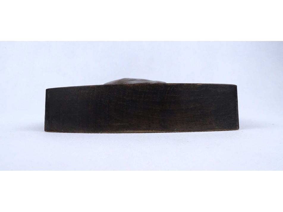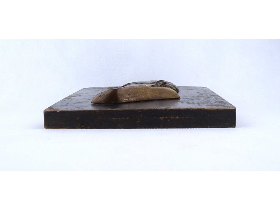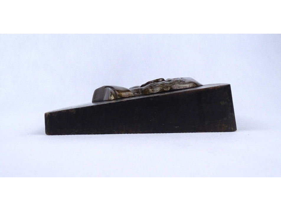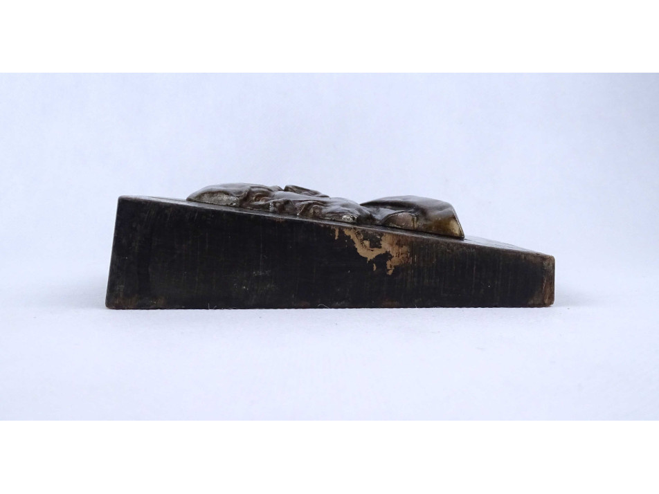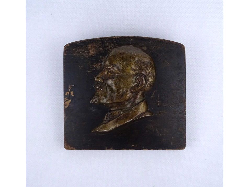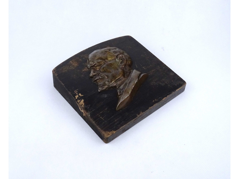 Festett fa talapzaton található domborműves fém Lenin plakett, íroasztali dísztárgy. A fa talapzat festése kopottas.