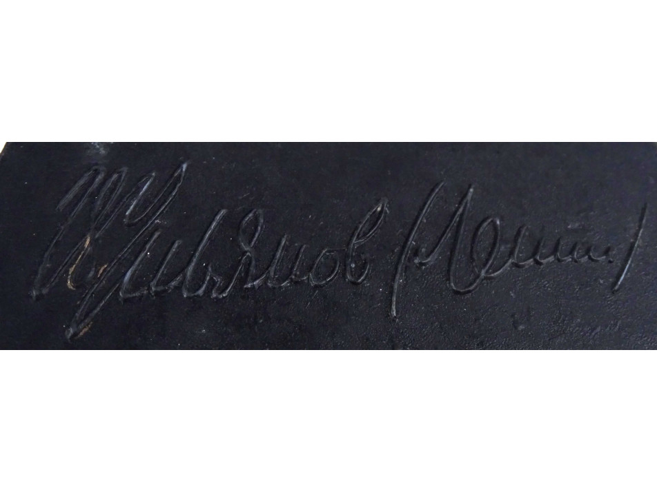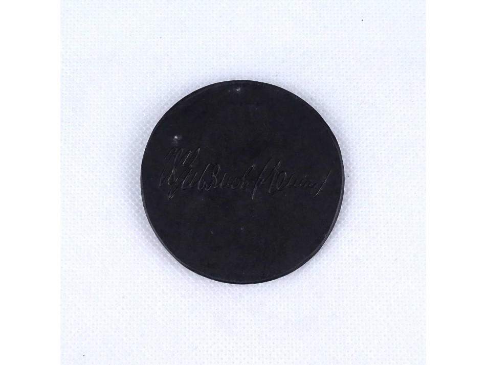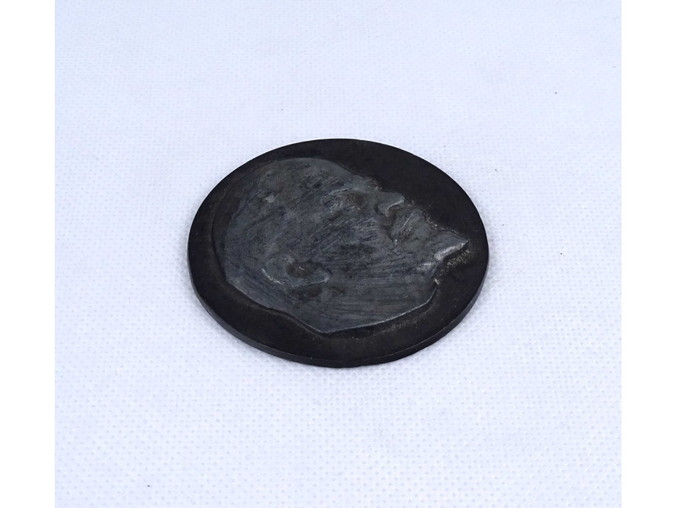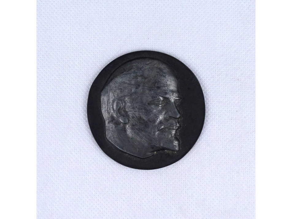 Régi vastagon ezüstözött fém plakett, rajta plasztikus Lenin portré, hátoldalán ciril betűs felirat.