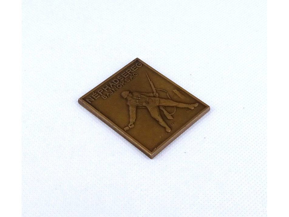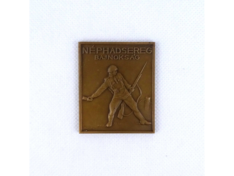 Régi, jelzett, az 1955-ös néphadrereg bajnokság emlékére kiadott, kétoldalas bronz sport plakett, emlékplakett. Egyik oldalán gránátot dobó katona, a másikon szocialista címer alatt vésett felirat és dátum látható.