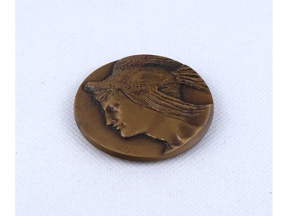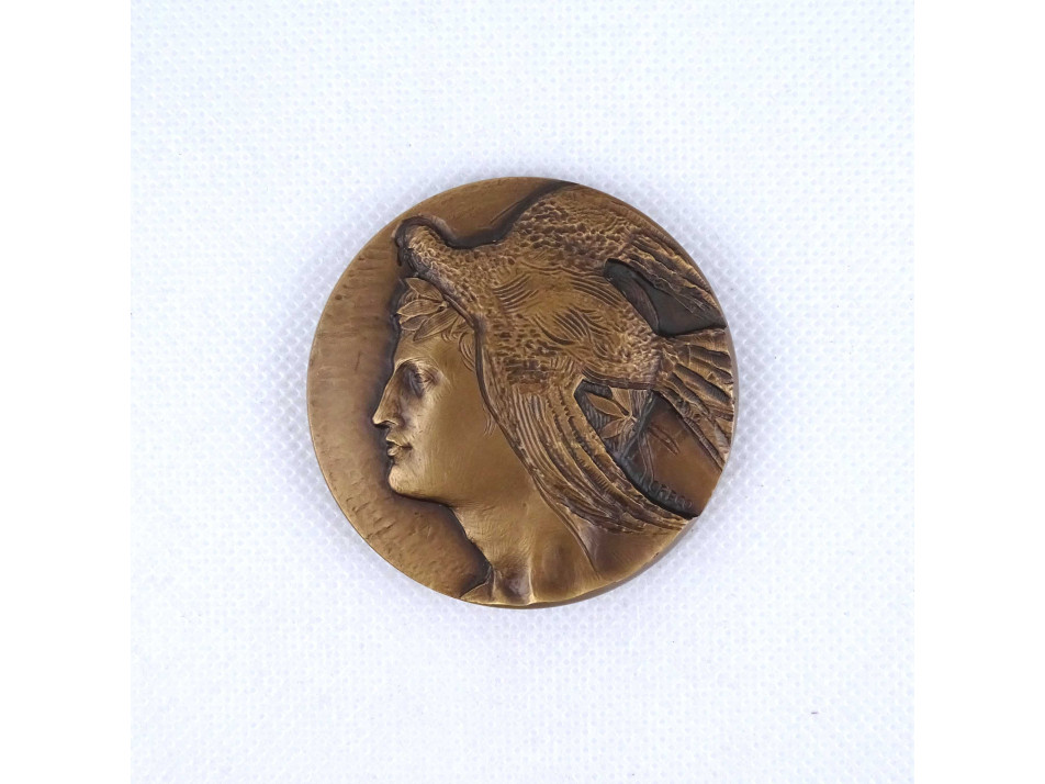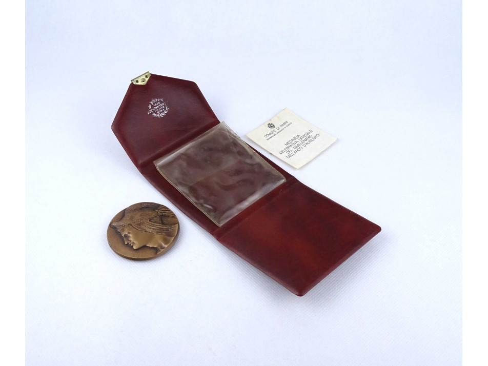 Régi, kétoldalas, plasztikus olasz nyelvű bronz plakett, emlékplakett, barna műanyag díszmappában, certifikációval. A plakett egyik oldalán domborműszerű antik férfi portré, a másikon stilizált díadalív, körülötte felirat látható. A plakett mindkét oldalán jelzett.