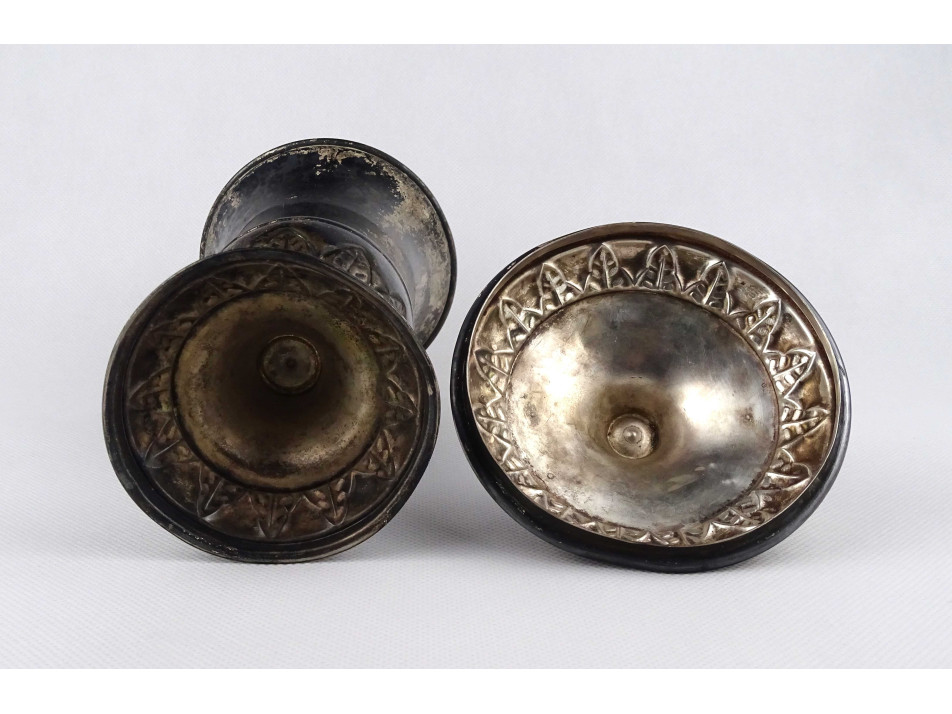 Régi, szép állapotú, ezüstözött, fém talpas, fedeles kupa vagy serleg. A fedelén és a talpán körben kézzel kalapált levélmintás díszítéssel.