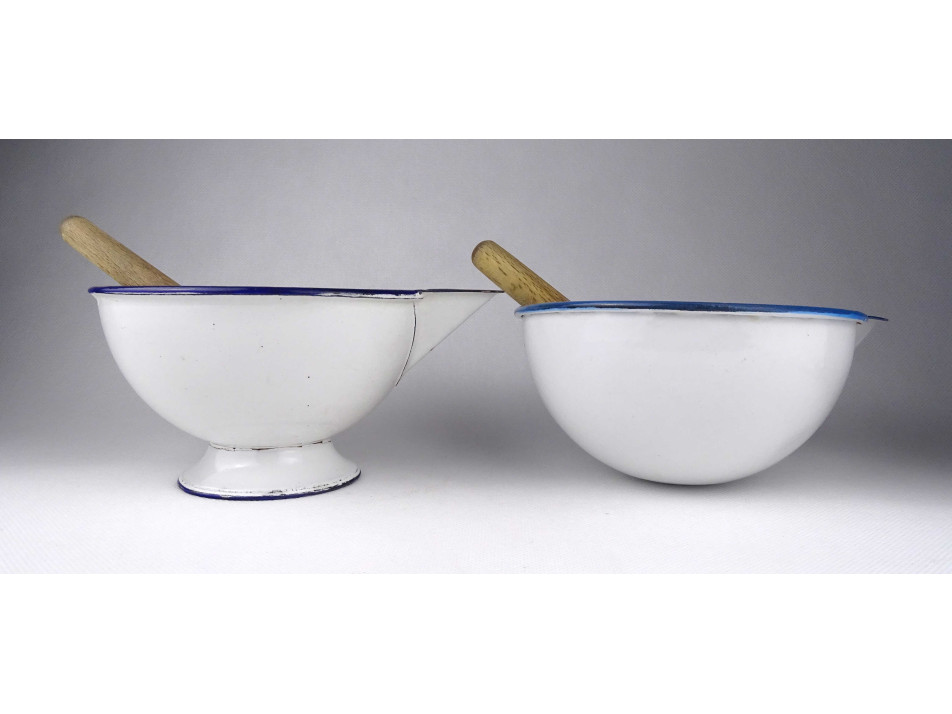 Régi, hibátlan állapotú, zománcozott fém keverőtál pár, labor felszerelés. Két darab gyógyszerész tál, patika edény a hozzájuk tartozó fa keverővel. Az egyik tál talpas, a másik félgömb alakú.