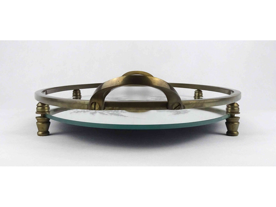Régi nagyméretű, réz kerettel és fülekkel rendelkező, négy lábon álló tálca, kínáló tál, ovális alakú levélmotívummal díszített tükör betéttel.