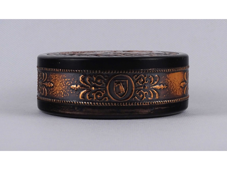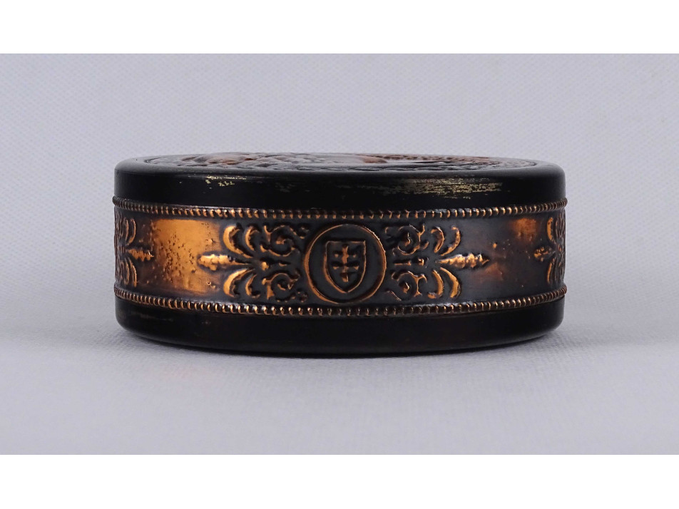 Régi Hunyadi Mátyás király arcképével díszített köralakú réz doboz 10.6 cm