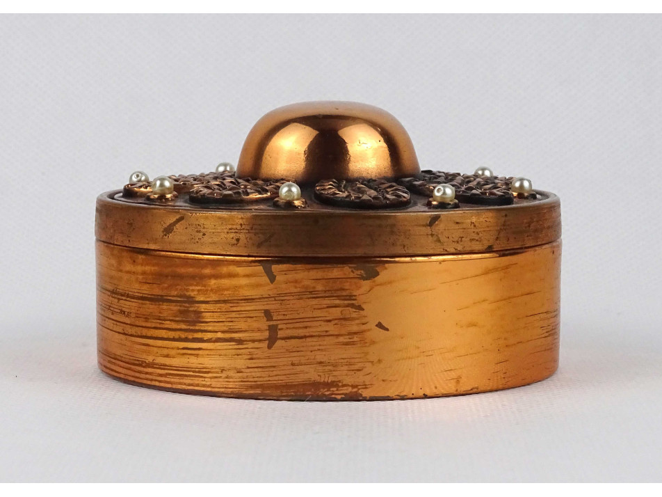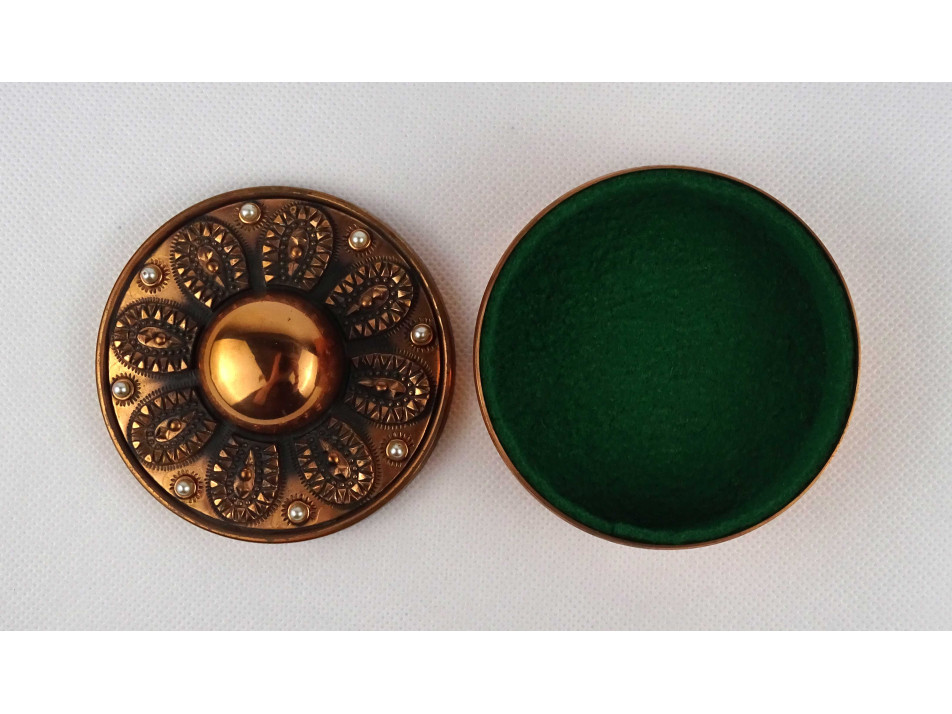 Hibátlan állapotú, köralakú iparművészeti vörösréz díszdoboz, ékszertartó doboz, zöld filc béléssel.
