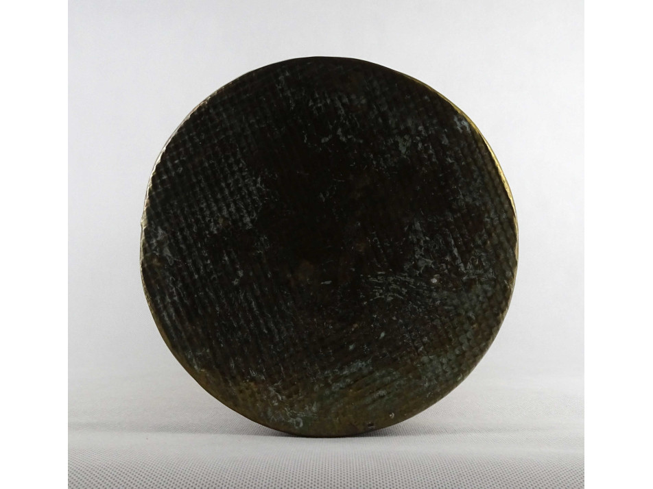 Régi, szép állapotú, sárgaréz lemezből készült, nagyméretű esernyőtartó. Oldalán plasztikus zsinórfűzér díszítéssel. A fenéklemezen néhány apró lyuk látható.