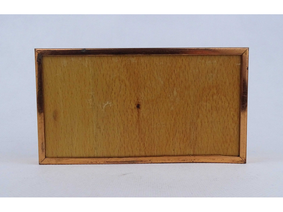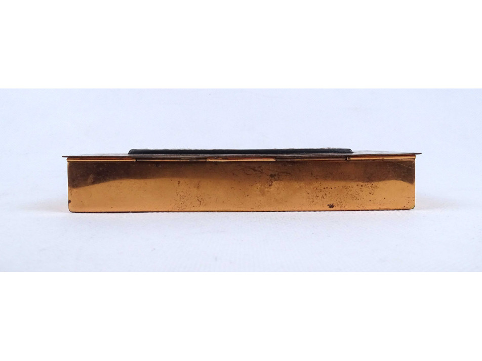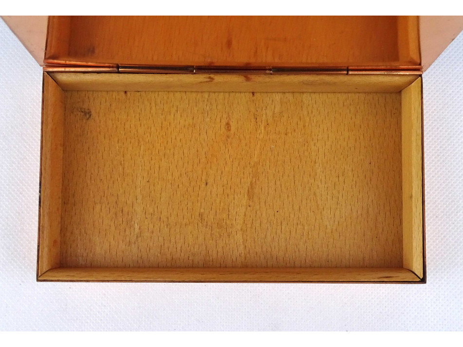Hibátlan állapotú, fabetétes réz doboz, díszdoboz, kártyadoboz, cigaretta kínáló. Fedelén plasztikus geometrikus rátétdísz található.