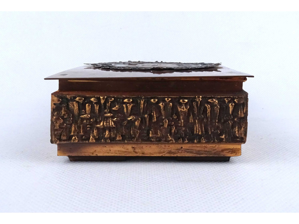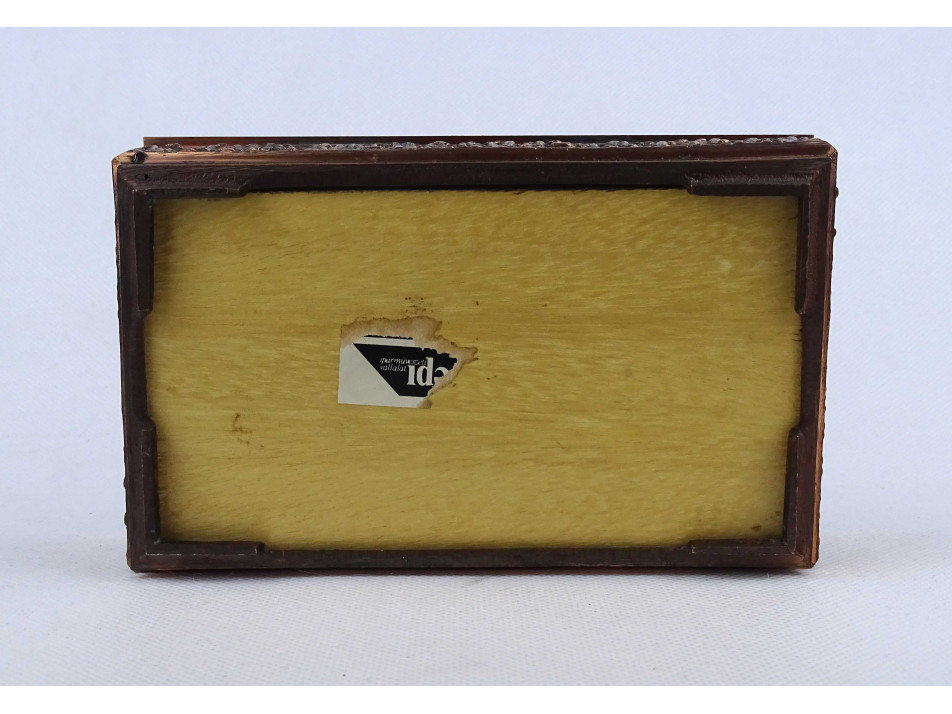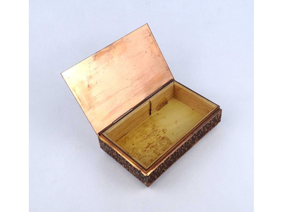 Retro, hibátlan állapotú, fa betétes, vörösréz díszdoboz, cigaretta kínáló doboz. Fedelén tölgyfa koszorúban katonai, légvédelmi eszközök, lokátor, rakéták és egy MIG 21 -es repülőgép, oldalán körben plasztikus emberalak díszítések láthatók.