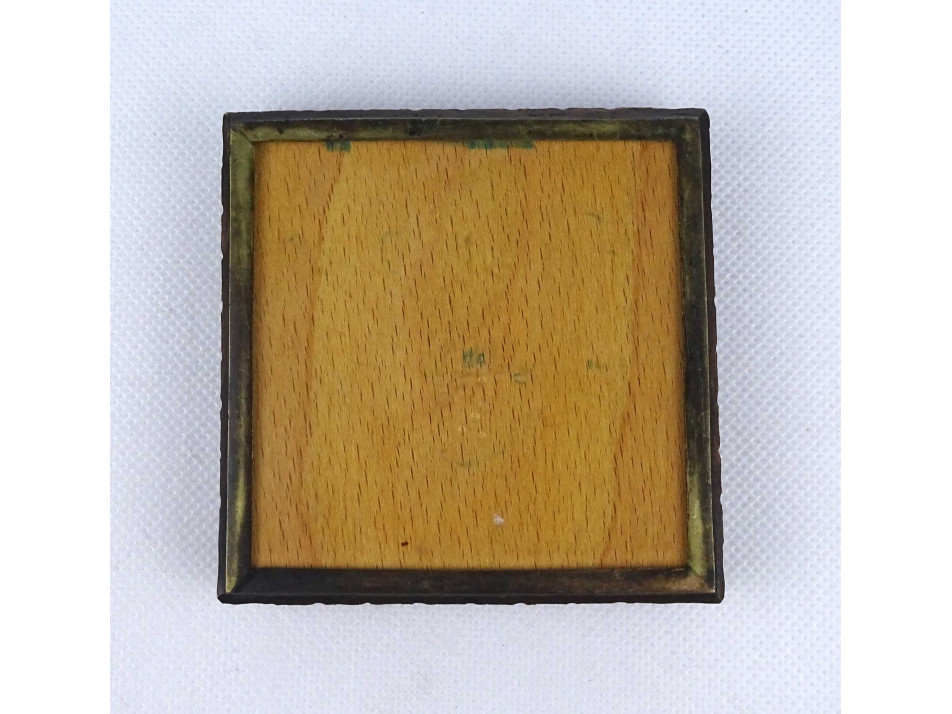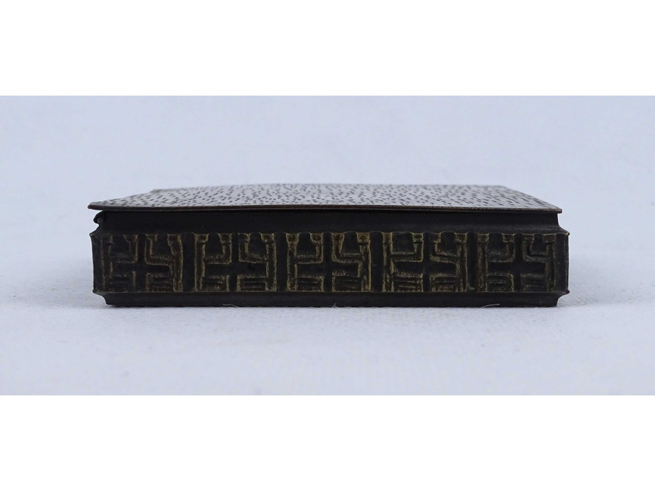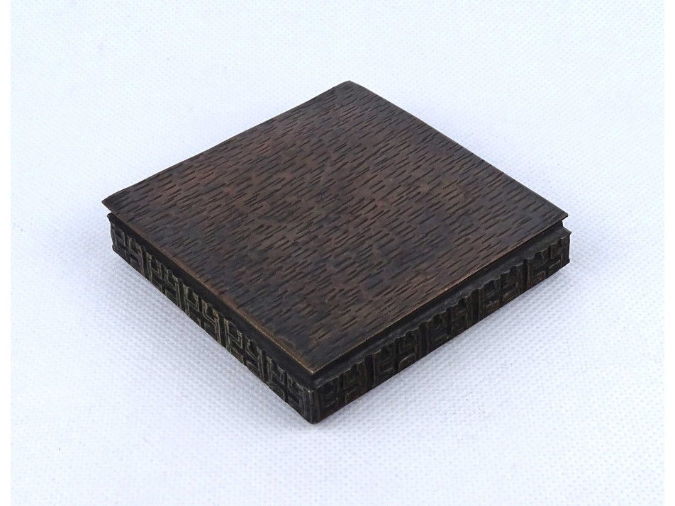 Hibátlan állapotú, kisméretű, fabetétes réz doboz, díszdoboz, kártyadoboz, cigaretta kínáló. Oldalát körben plasztikus minták díszítik.