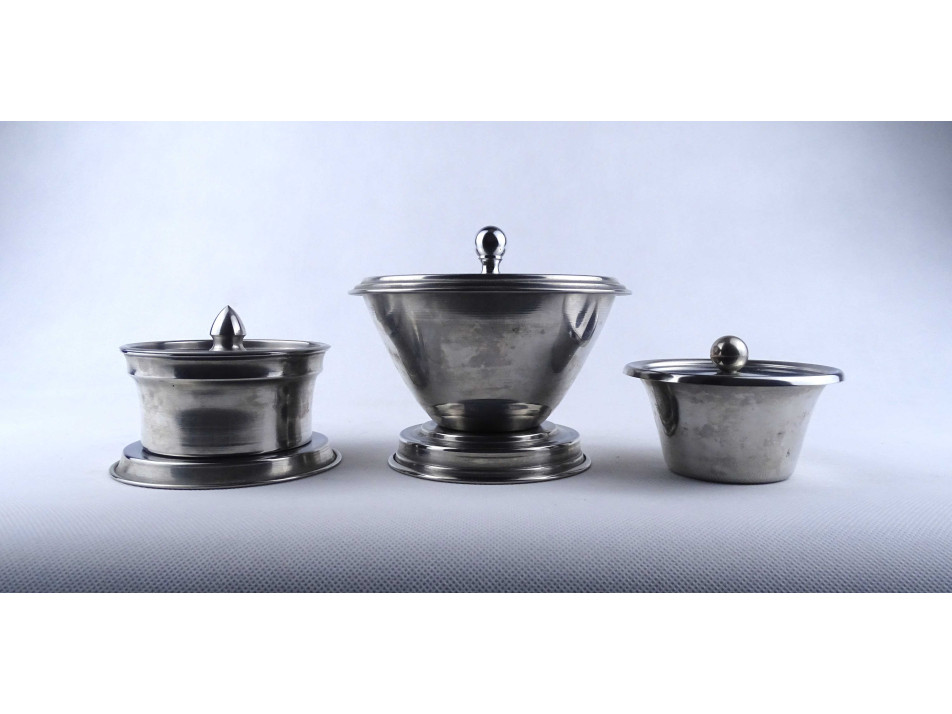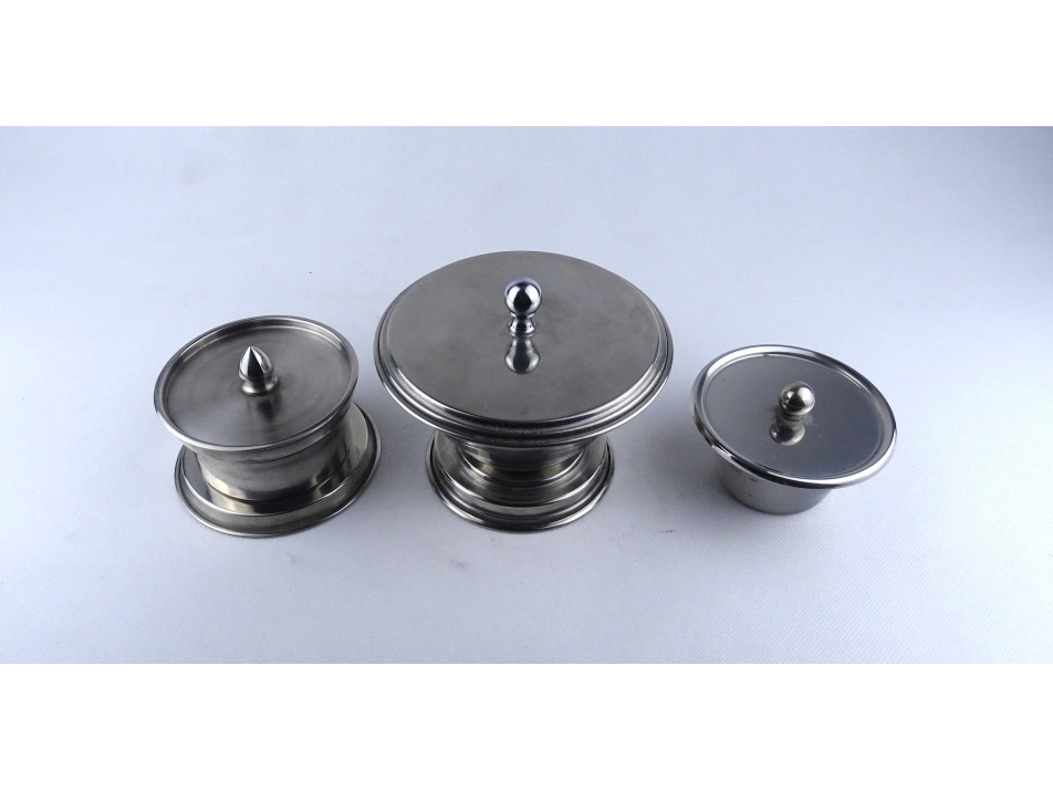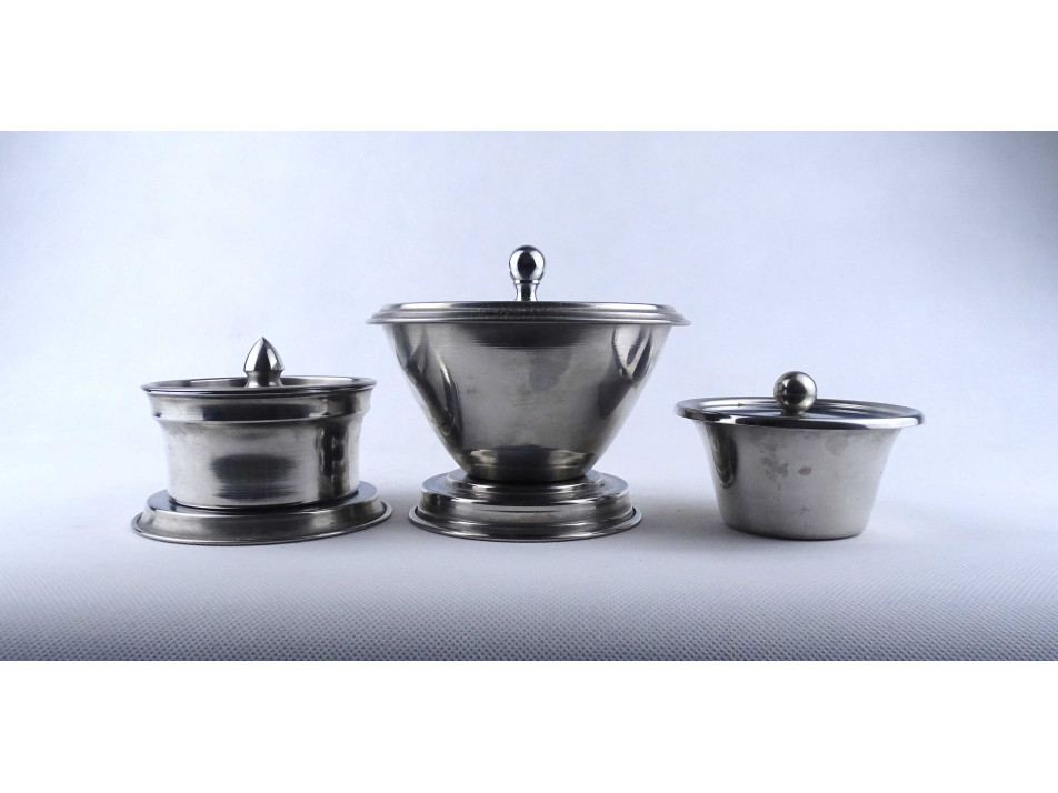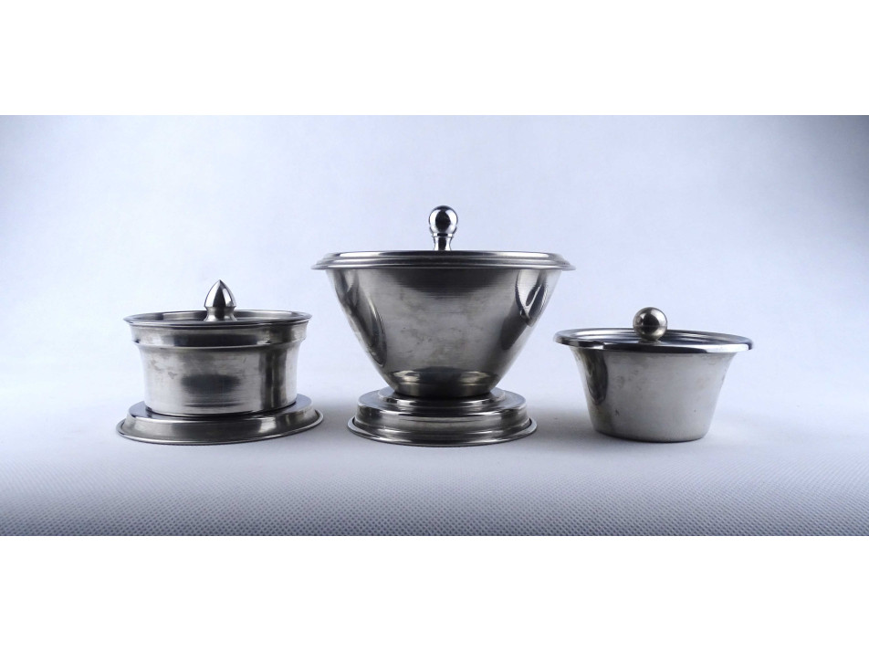 Régi 3 darabos fém doboz csomag, fedeles talpas cukortartó, cukorkínáló bonbonier szett.