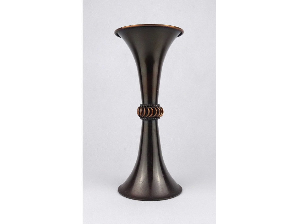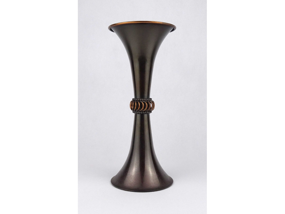 Hibátlan állapotú, ötvös vörösréz művészi váza, közepén plasztikus, fonott gyűrű díszítéssel.