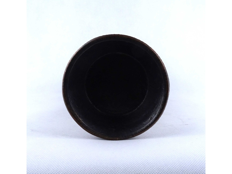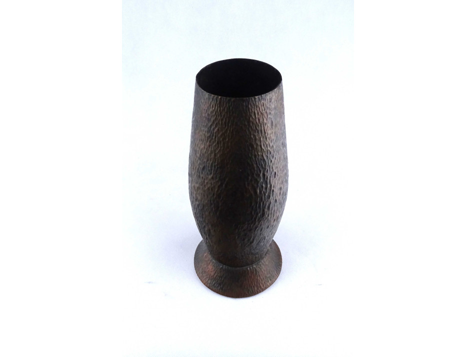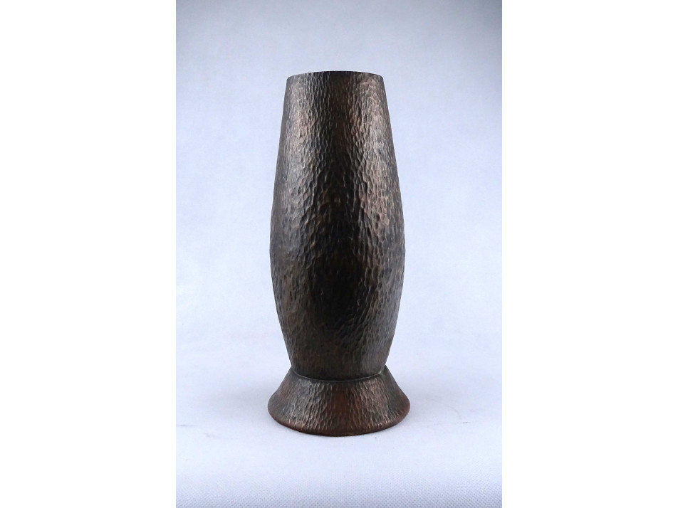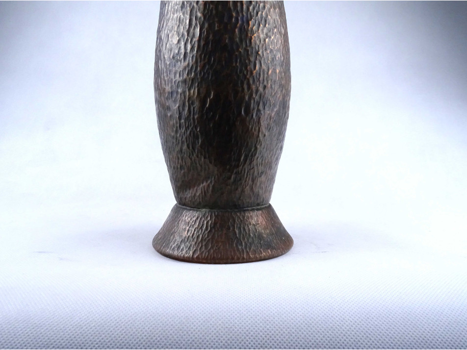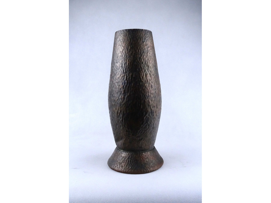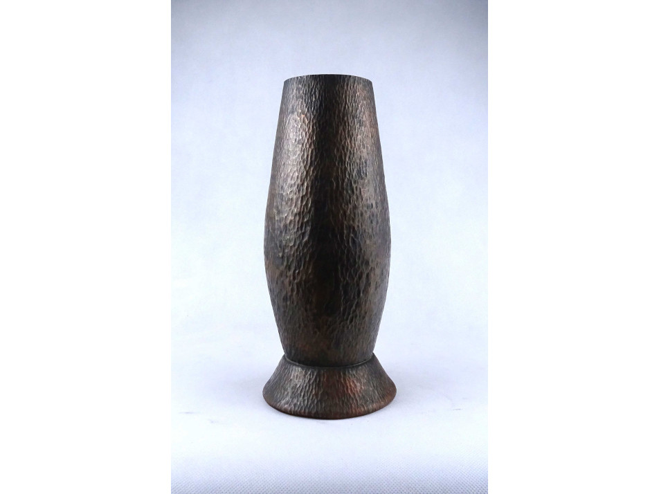 Retro, szép állapotú, jelzetlen kalapált iparművészeti vörösréz váza, díszváza. A váza testén, a talp közelében egy horpadás látható.