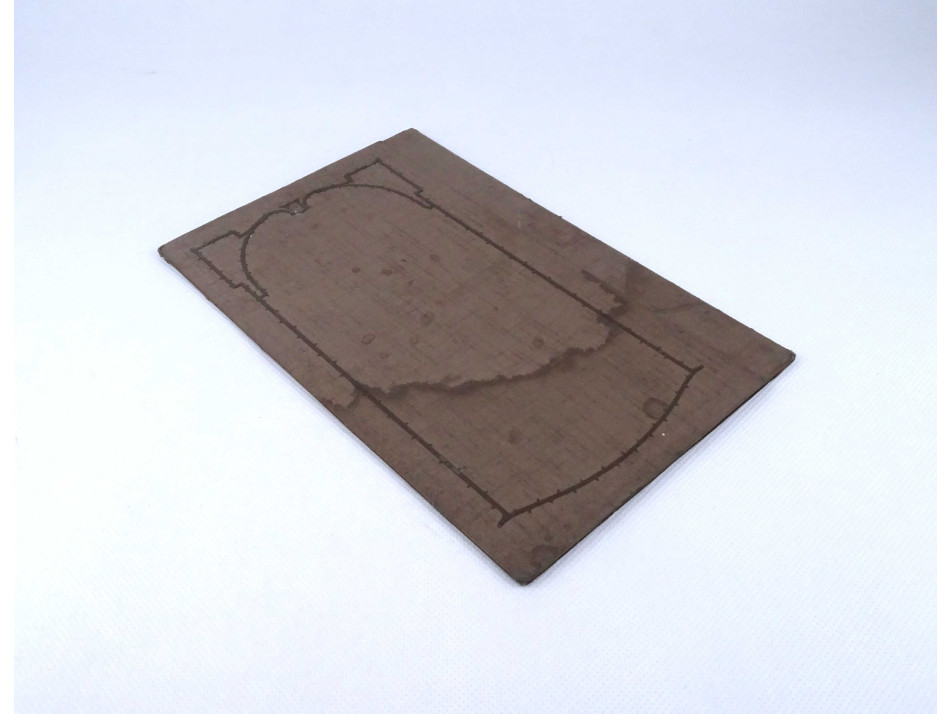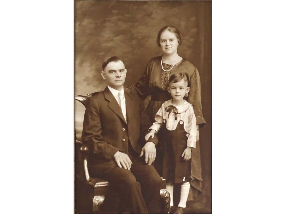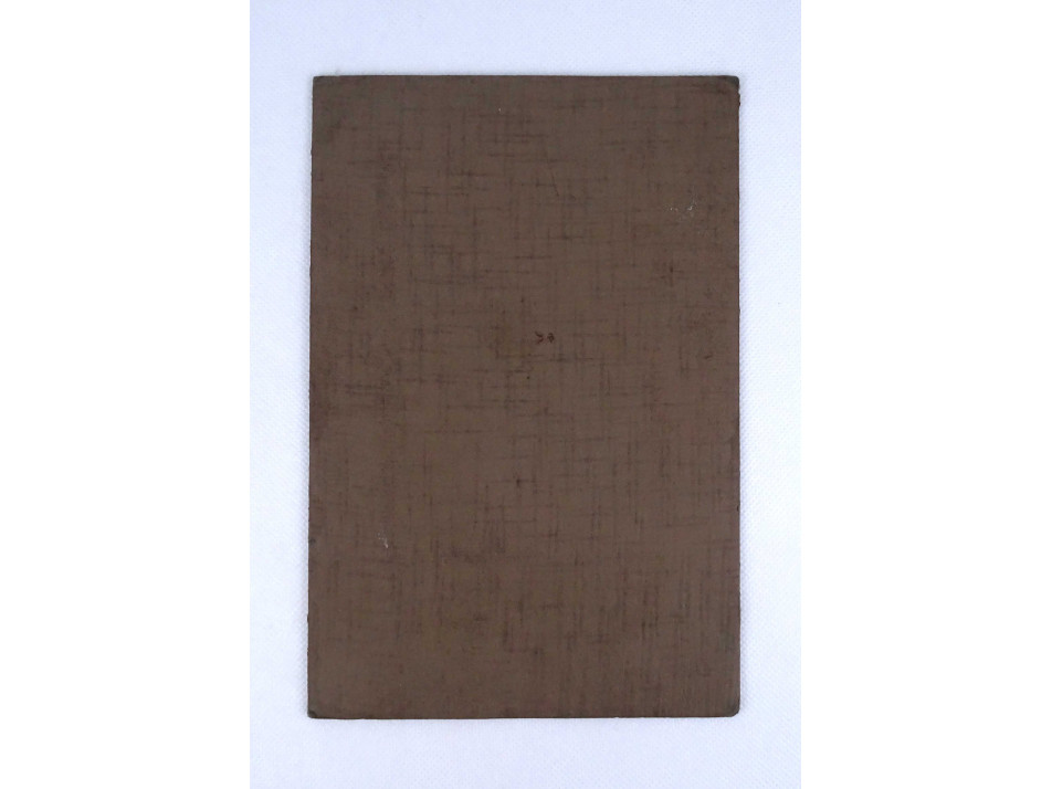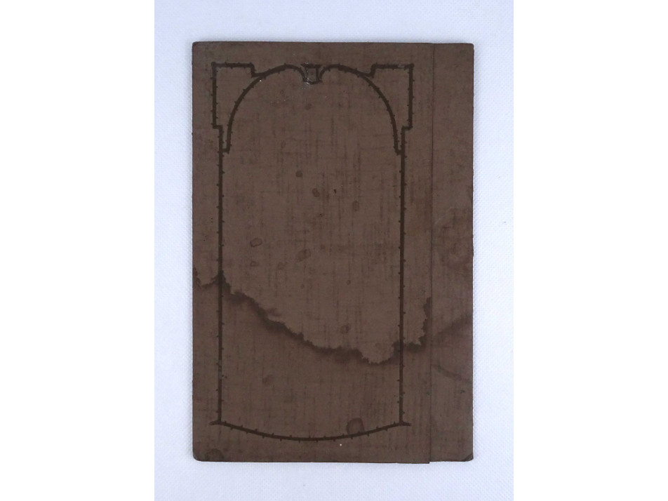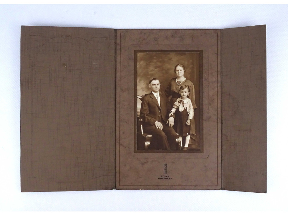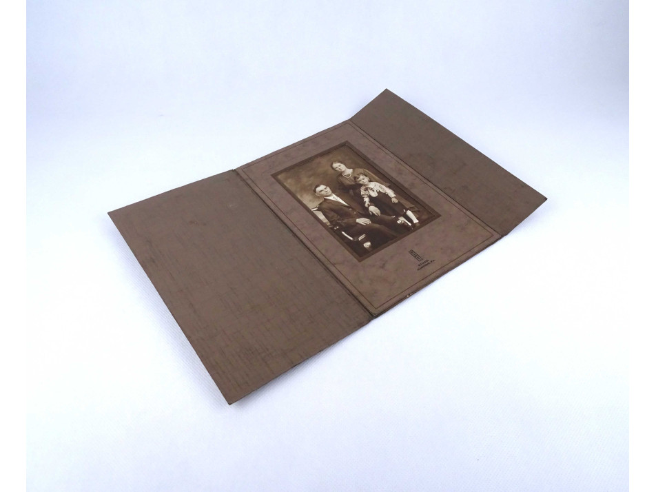 Régi, szép állapotú, kétoldalról könyvszerűen behajtható fedeles karton keretbe ragasztott, fotográfia. Egy három fős családot ábrázoló csoportkép. A kartonfedélen nyomott szecessziós keretszerű minta látható. A fedél nedvességtől foltos.