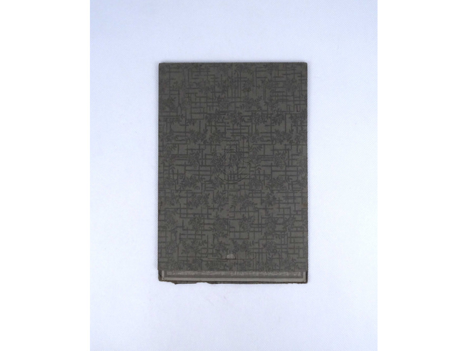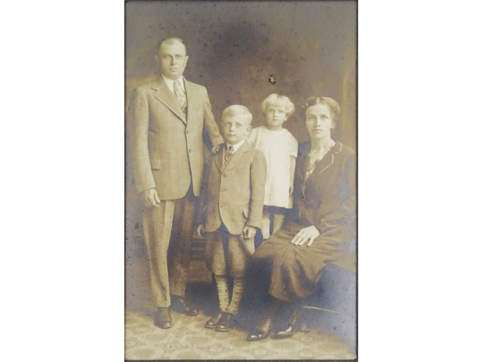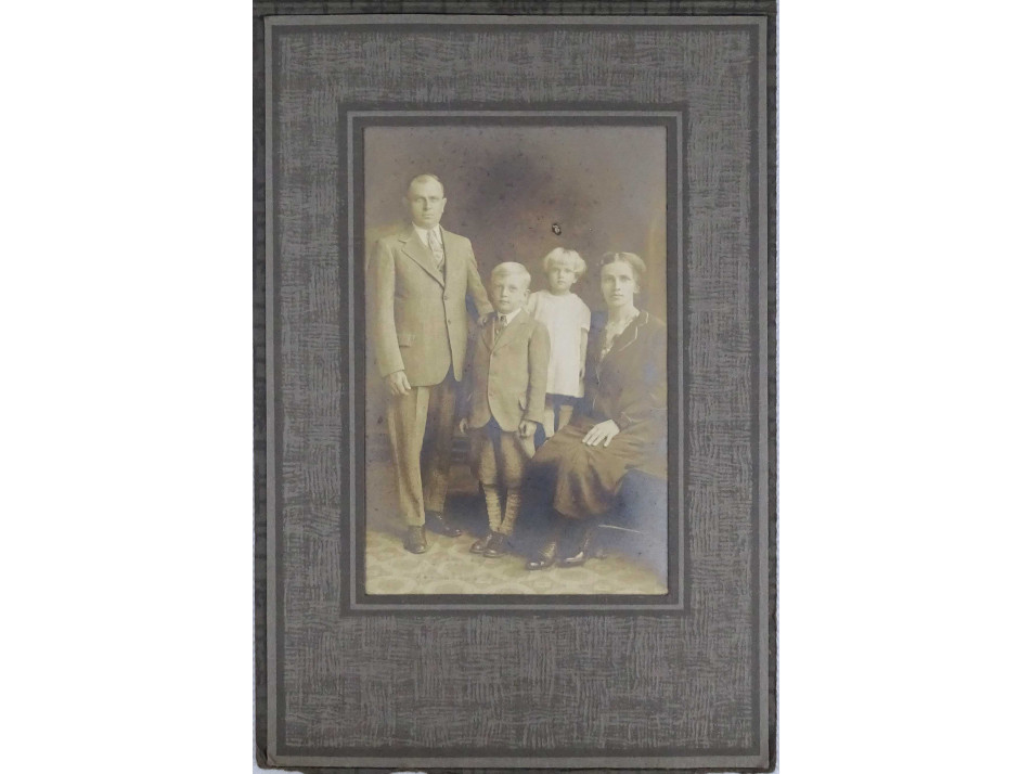 Régi, szép állapotú, behajtható fedeles karton keretbe ragasztott fotográfia. Egy négy fős családot ábrázoló csoportkép. A kartonfedélen nyomott szecessziós minta.