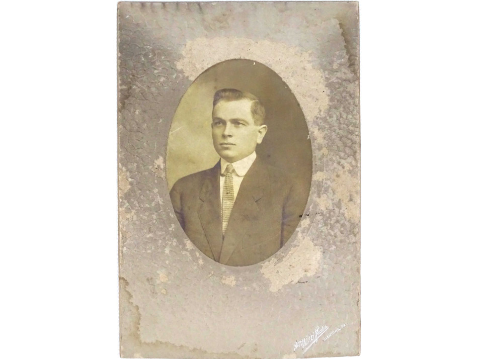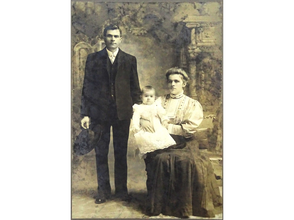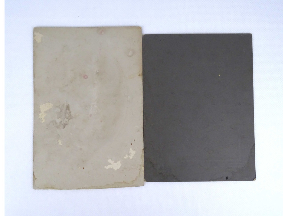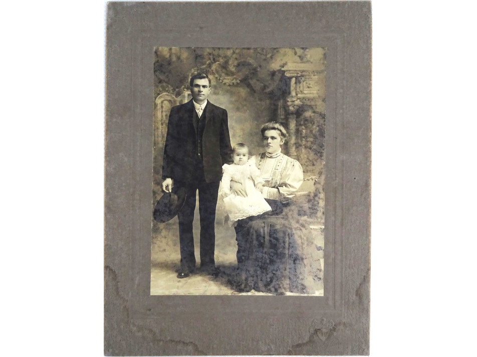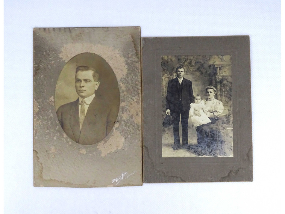 Két darab, régi, szép állapotú, kemény karton keretre ragasztott fotográfia. Az egyik egy három fős családot ábrázoló csoportkép, a másikon egy fiatal férfi portréja látható. A hordozó kartonok, kissé sérültek, nedvességtől foltosak, a fotográfiák épek.