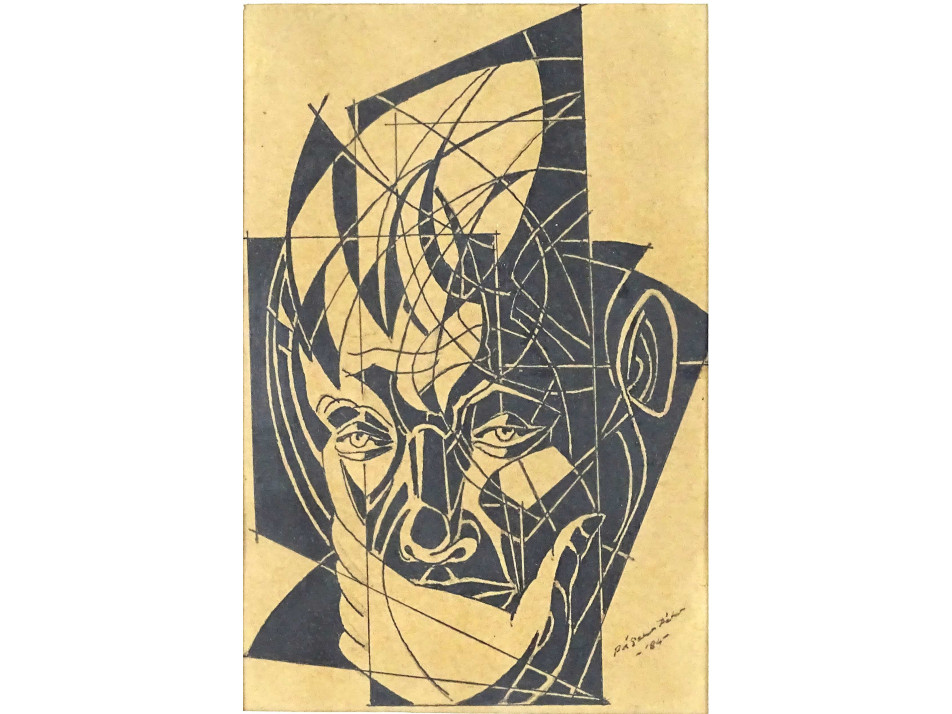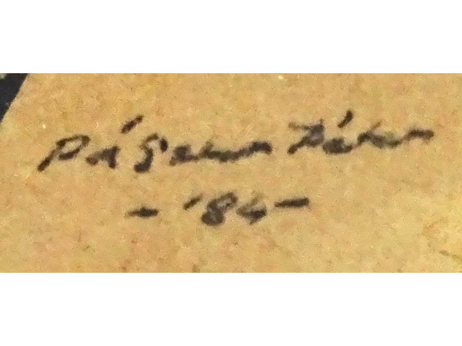 Papír tusrajz, paszpartuzva, üveglap mögött, szép állapotú barna keretben. Akasztási lehetőséggel rendelkezik. A keret felső sarkai sérültek.