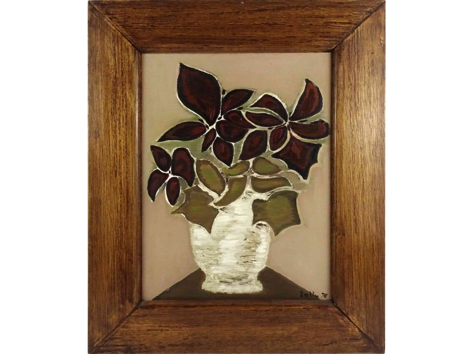 Jelzett, olaj farost festmény, virágcsendélet, szép állapotú széles barna fa keretben.