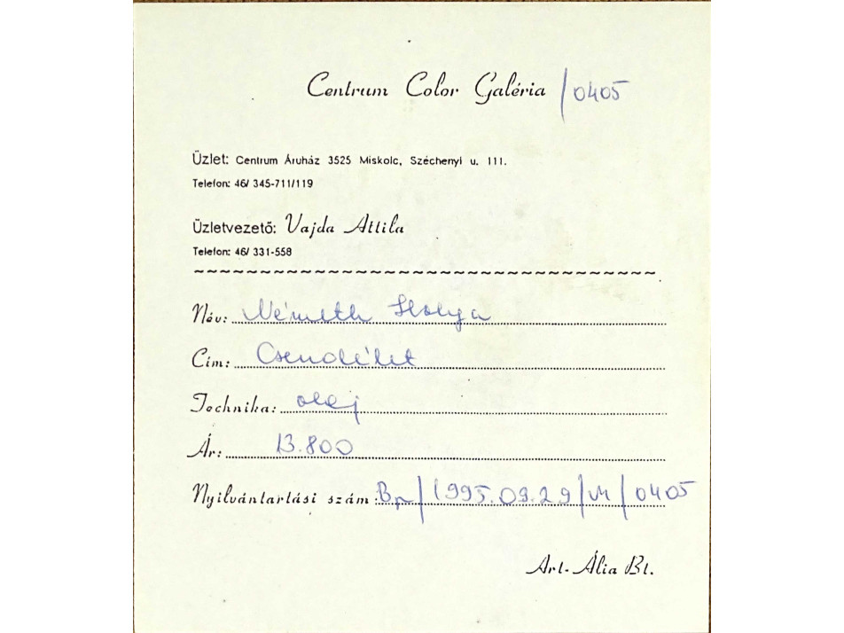 A festmény hátoldalán Centrum Color Galéria papírcímkéje, rajta felirat: