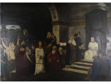 Régi, nagyméretű vallási témájú színes papír nyomat, olaj nyomat, üveglap mögött, régi sérült, aranyozott keretben.