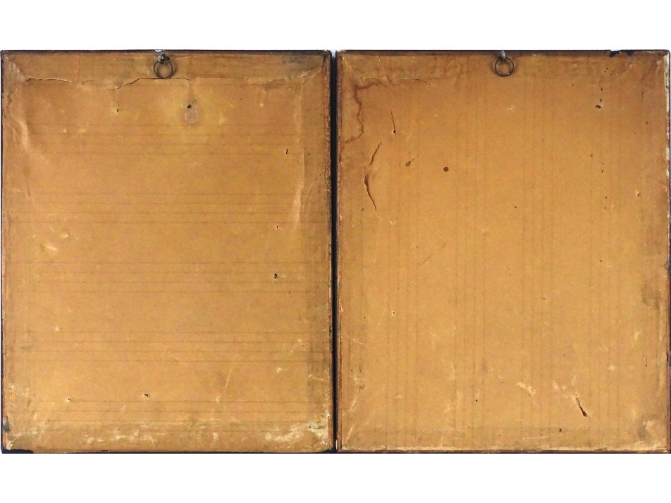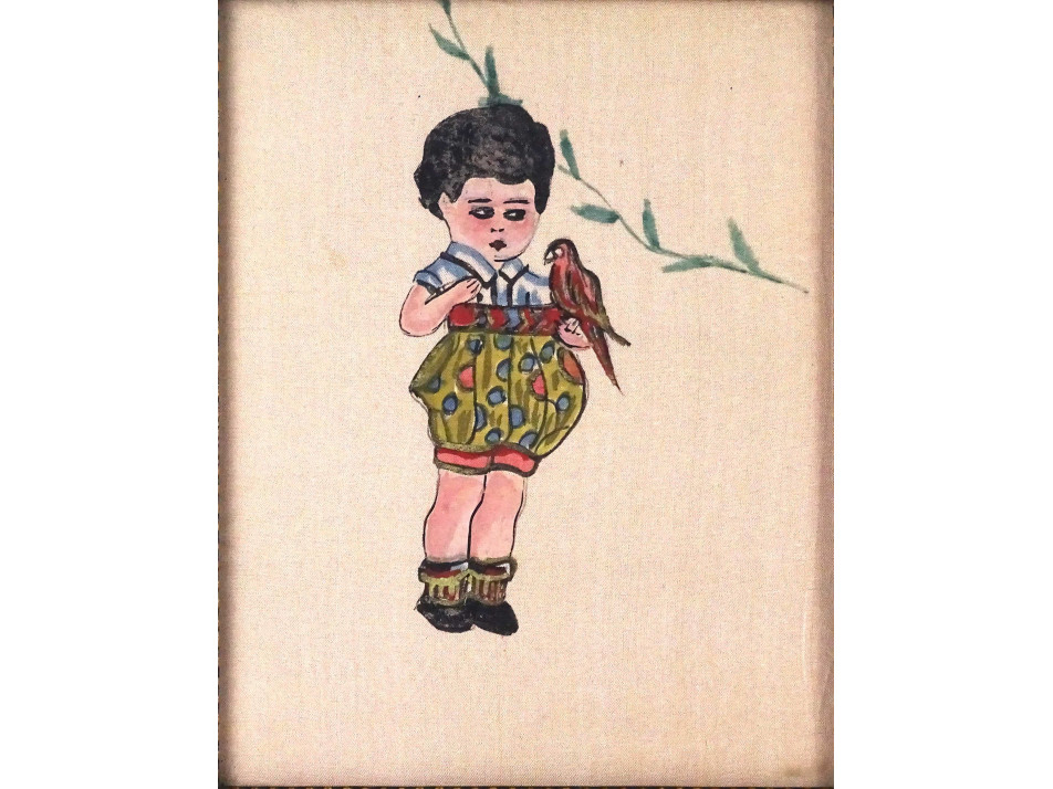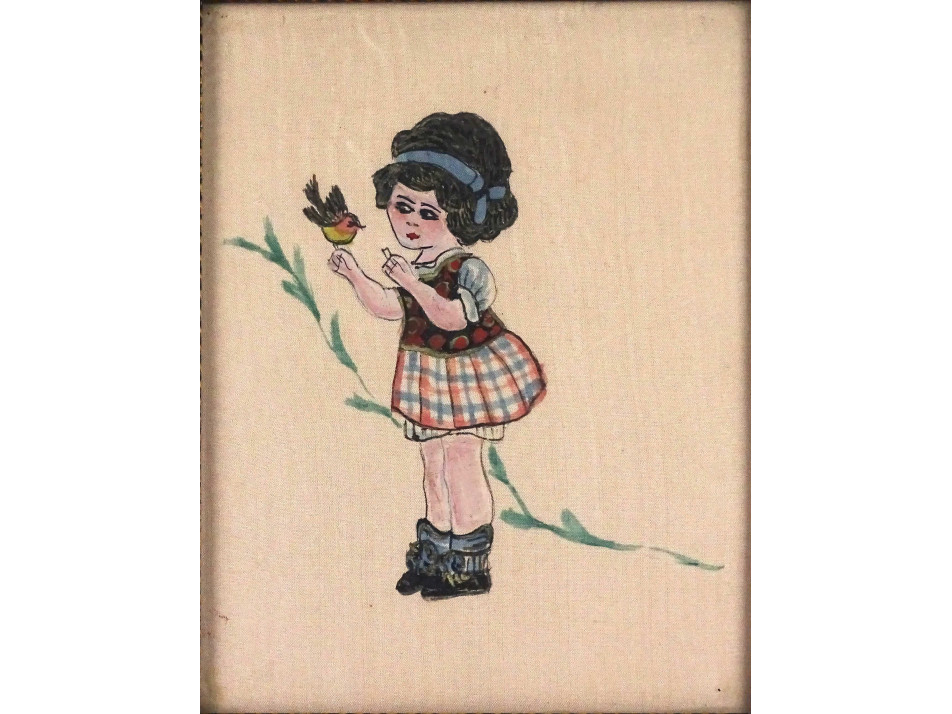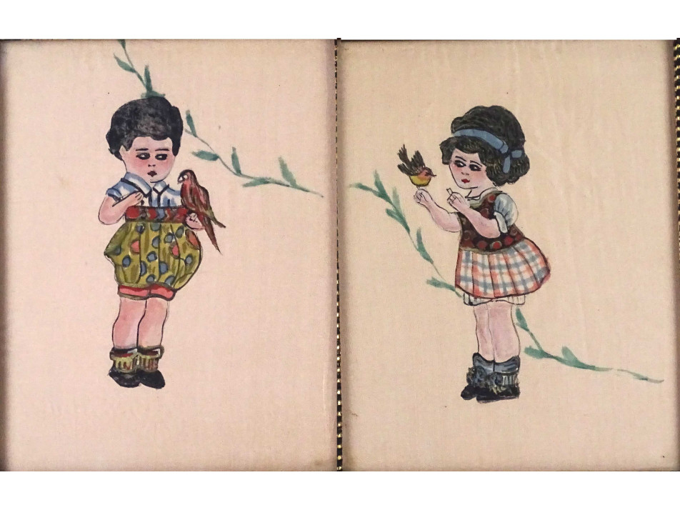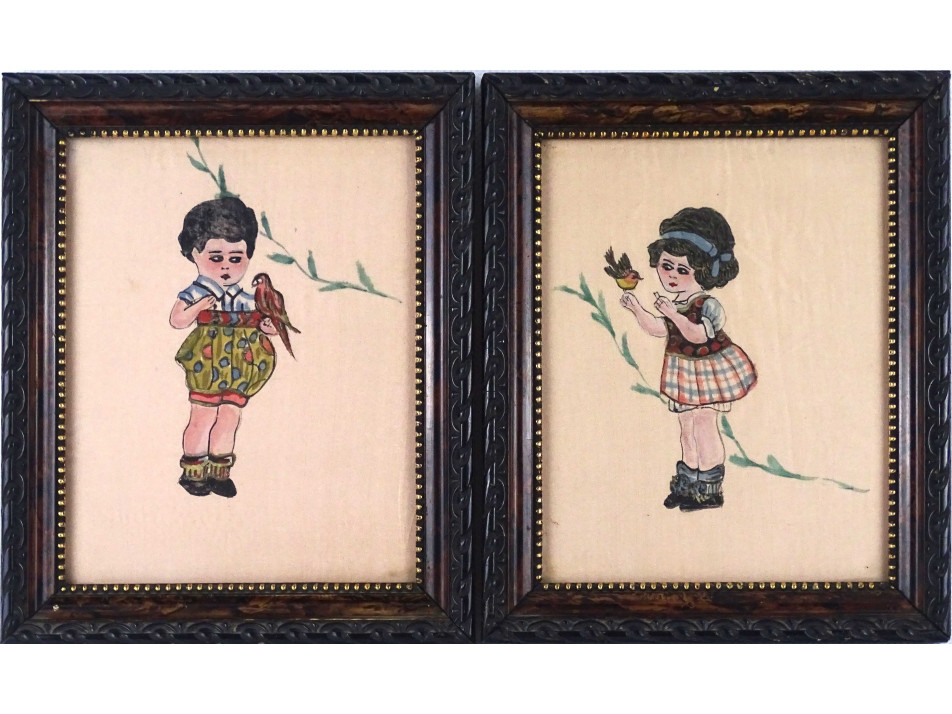 Kisméretű, keretezett, festett selyemkép pár. Üveglap mögött, díszes keretben található, selyemre festett madarakat etető gyerek, egy kisfiú és egy kislány.