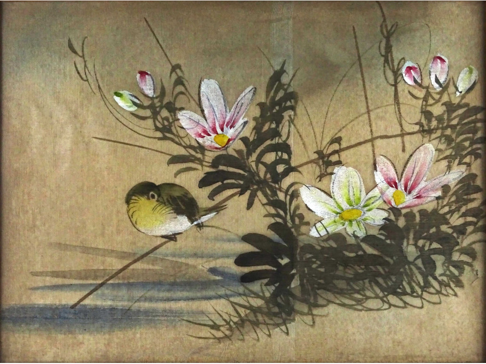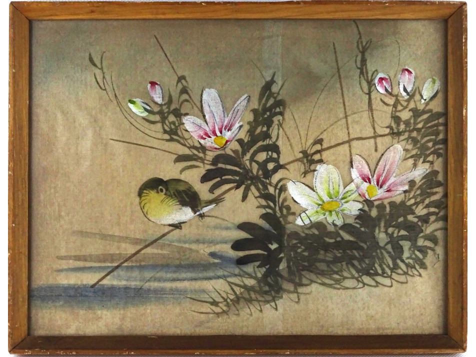 Régi, keleti selyemre készített festmény, selyemkép, kismadarat és virágokat ábrázoló festmény, üveglap mögött, léckeretben.