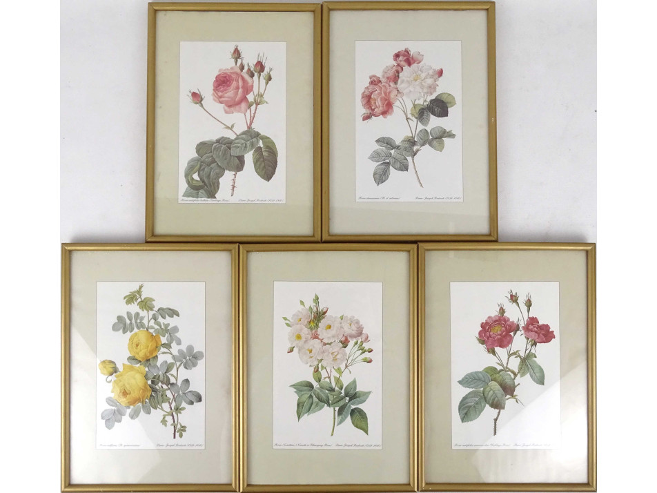 Öt darab régi rózsa fajtákat bemutató színes virág nyomat, botanikai illusztráció, üveglap mögött, aranyozott keretben. Akasztási lehetőséggel rendelkeznek.