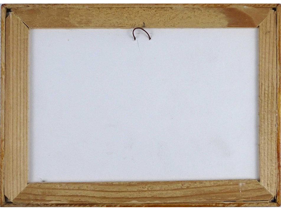 Kisméretű papír akvarell téli tájkép, kék paszpartuban, üveglap mögött, vékony léckeretben.