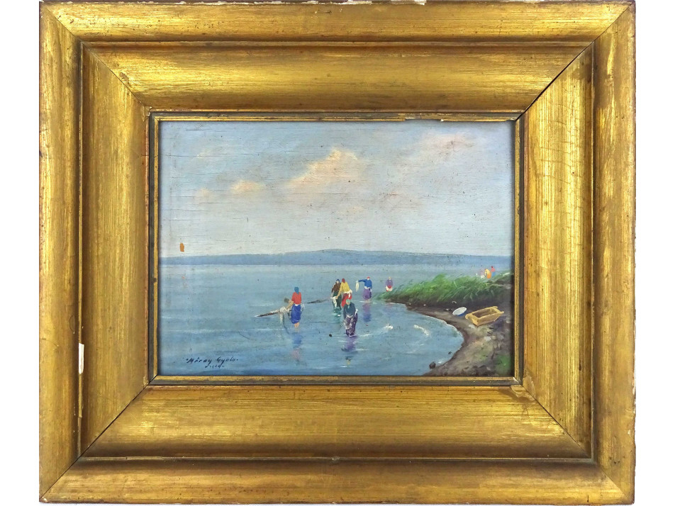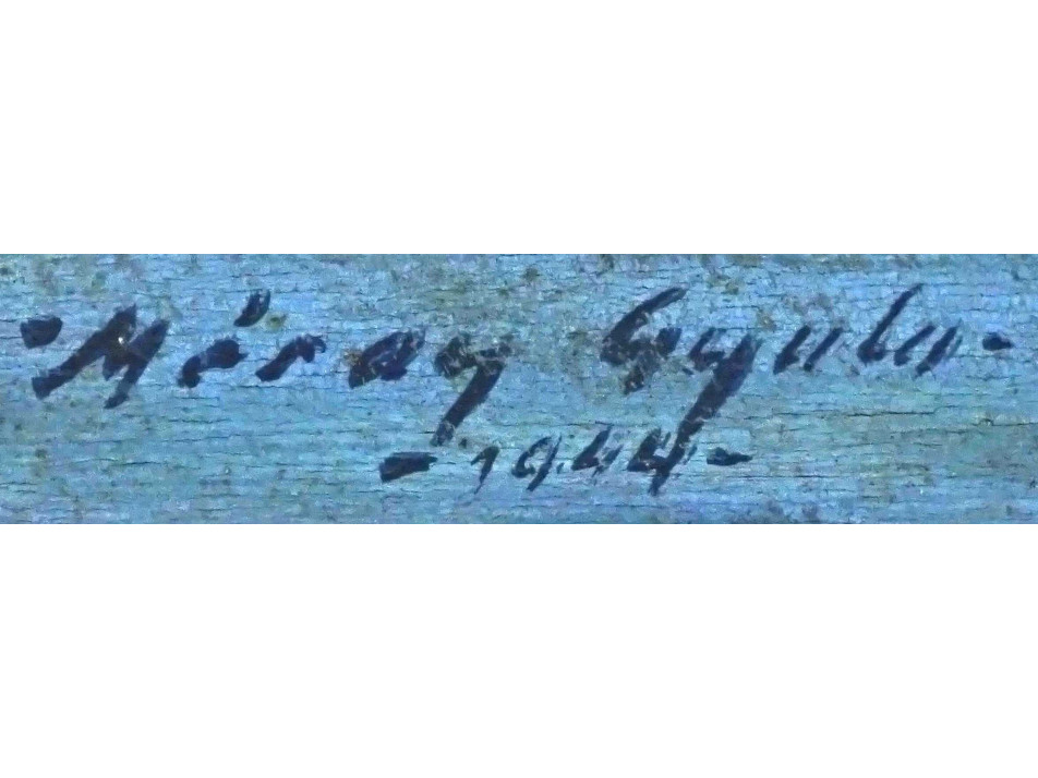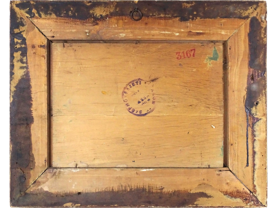 Olaj fatábla festmény, szép állapotú széles arany keretben. A festményen és a kereten is több apró sérülés látható. Akasztási lehetőséggel rendelkezik.