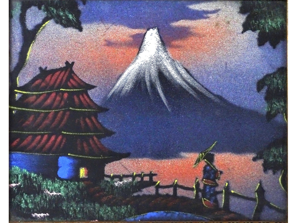 Régi, keleti, kínai festett tájkép, selyemkép pár üveglap mögött, szép állapotú arany keretben. A kereteken több apró sérülés látható.