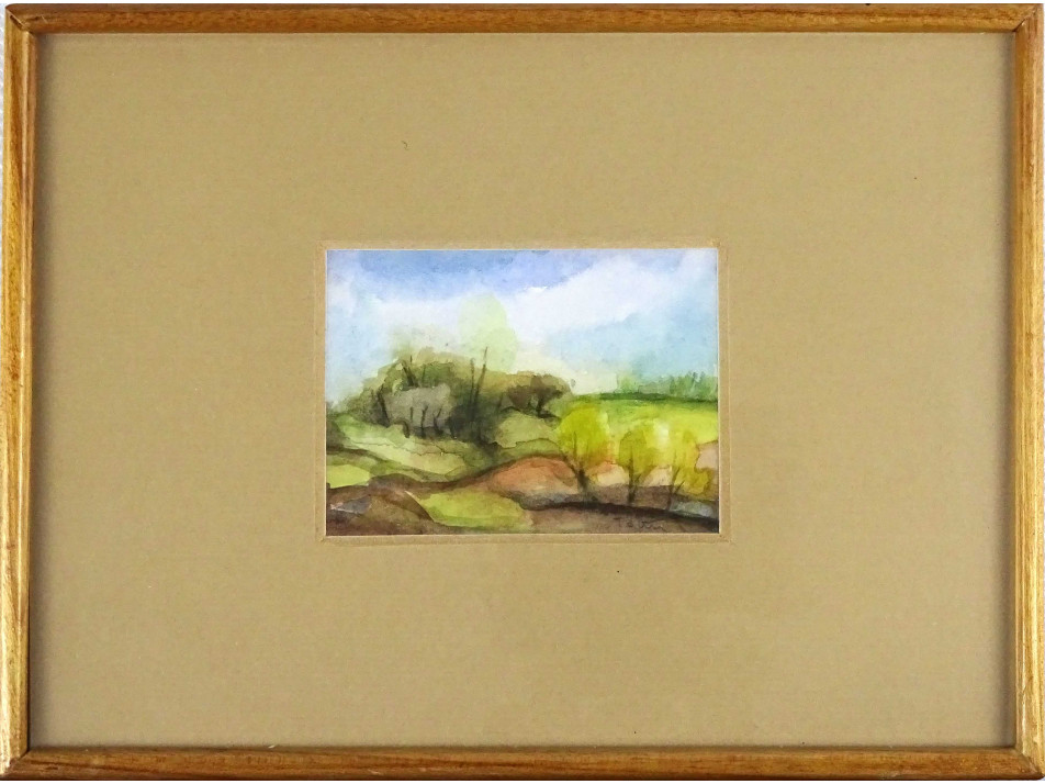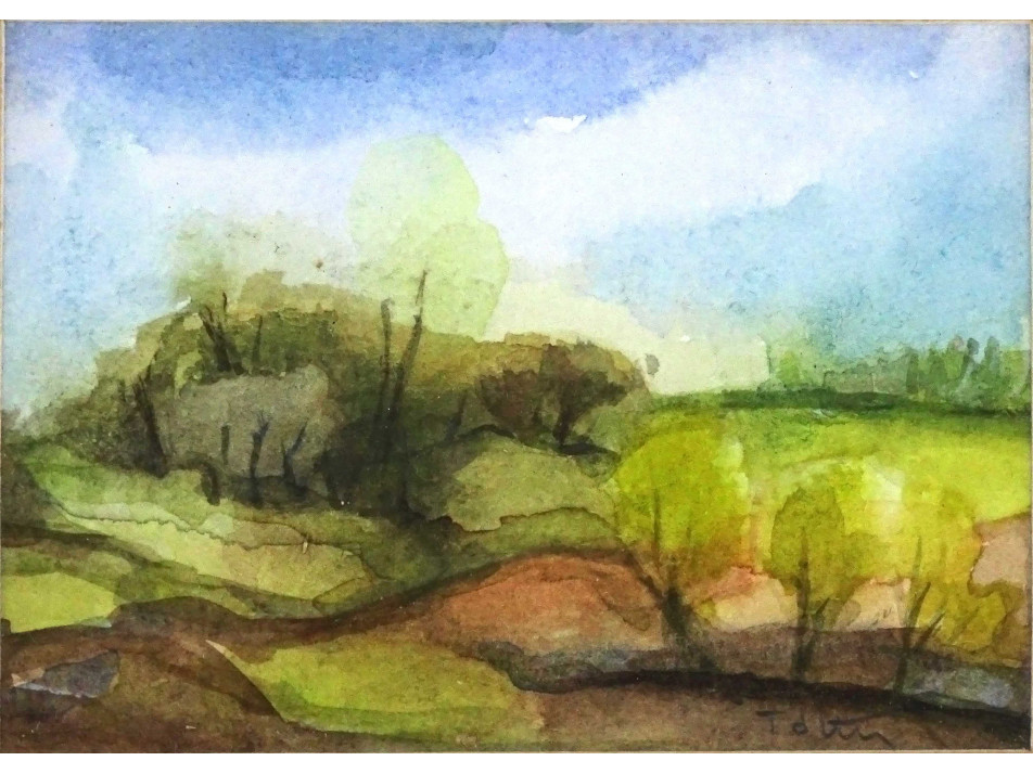 Tóth László : Tavaszi domboldal - kisméretű akvarell tájkép
