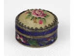 Antik hímzett fedelű, tűzzománc gyűrűtartó, ékszertartó szelence