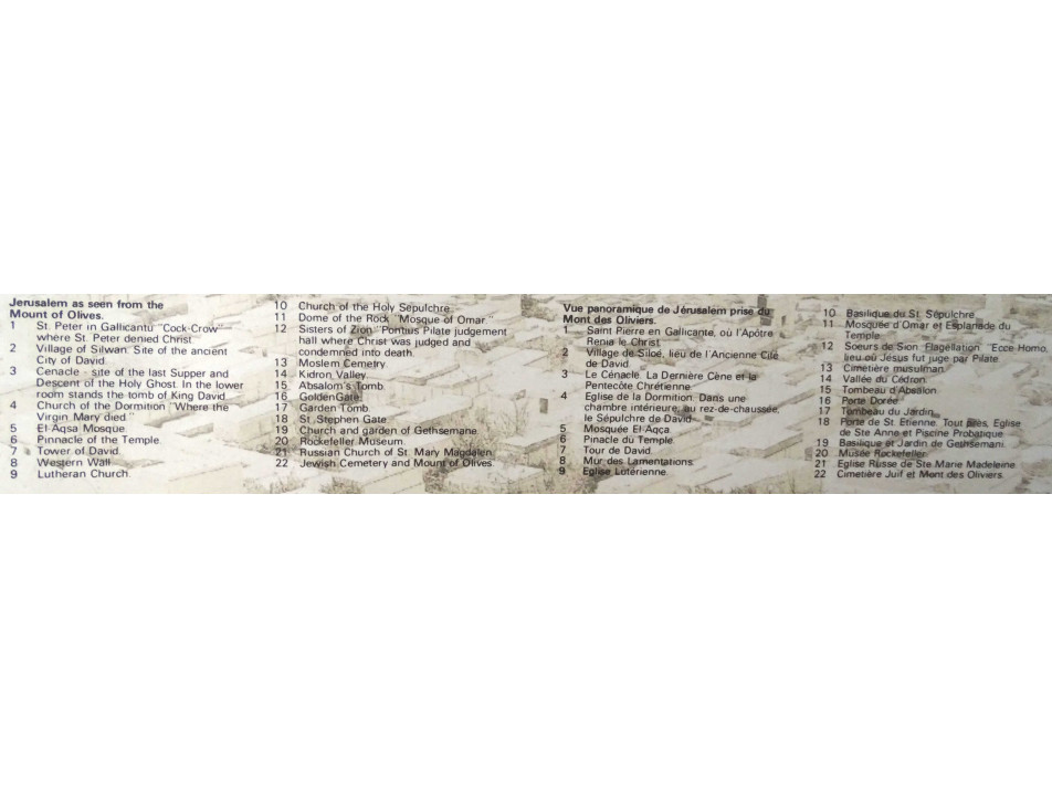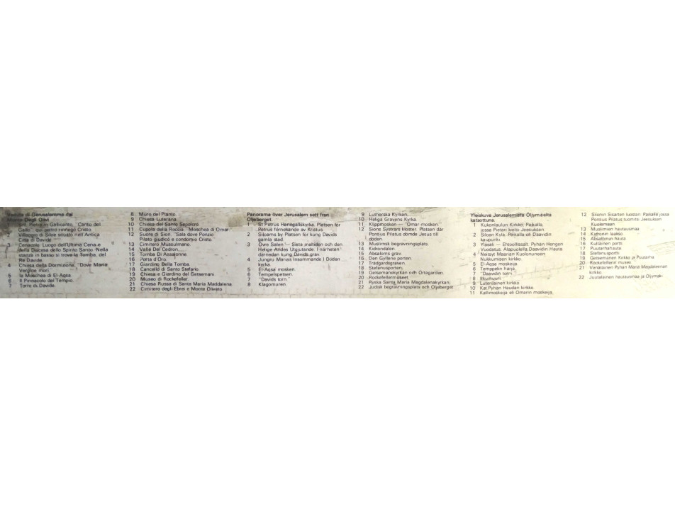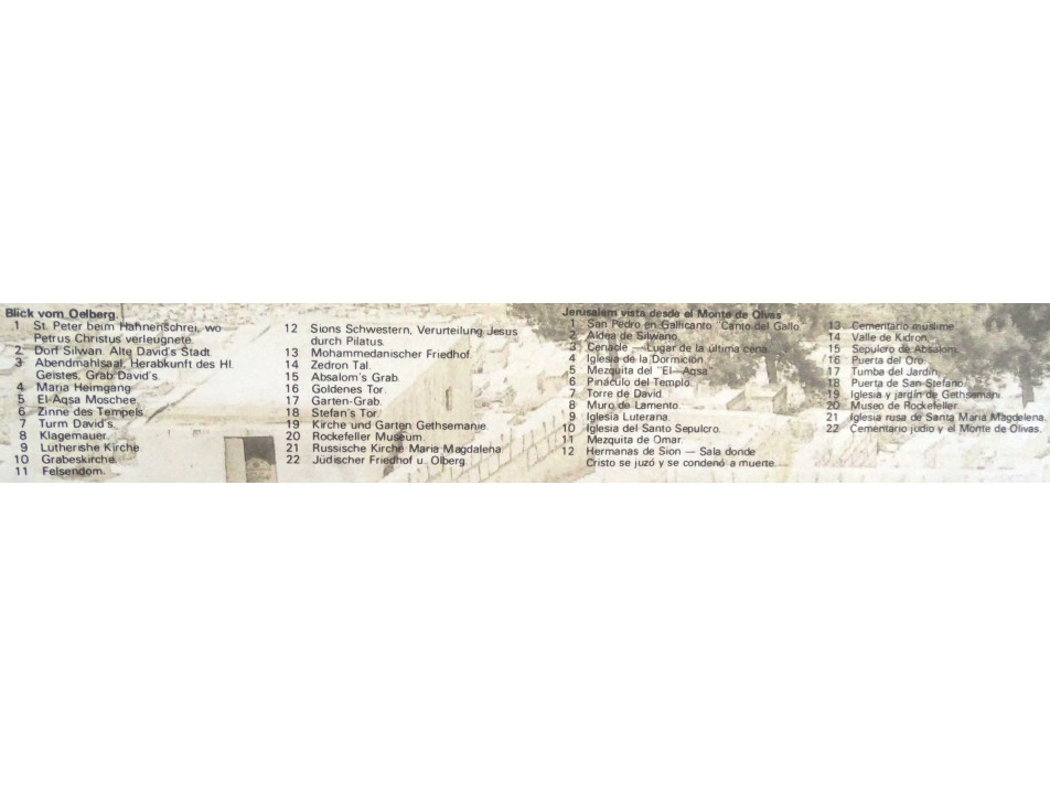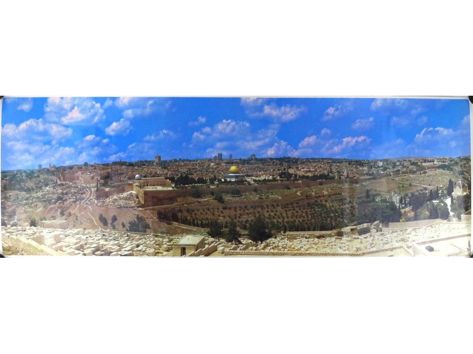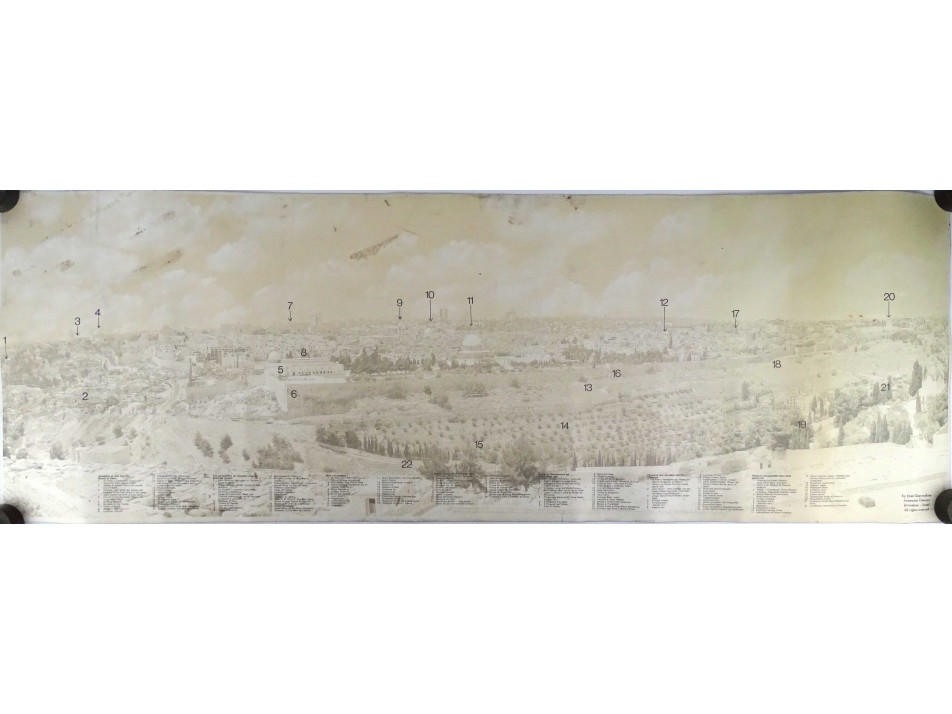 Nagyméretű fotótechnikai nyomat, keret nélkül, feltekert állapotban. Jeruzsálem város látképének színes panorámaképe, a hátoldalon a látnivalók sorszámozott magyarázatával hét nyelven.