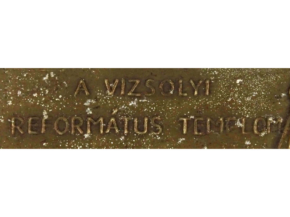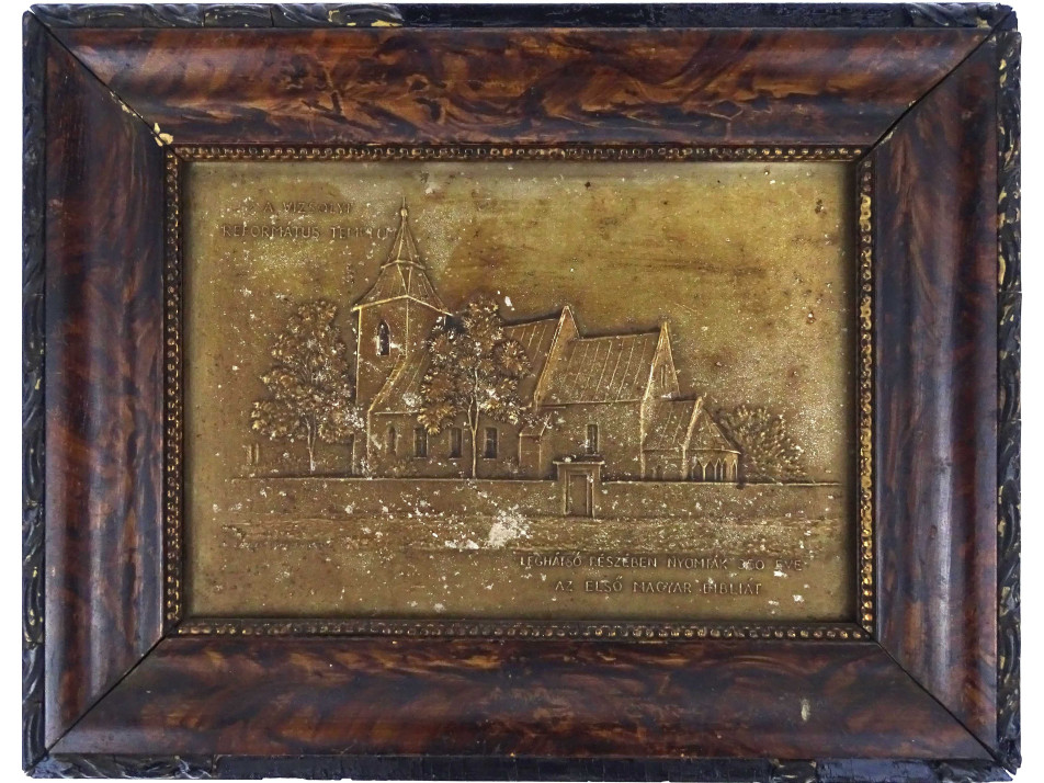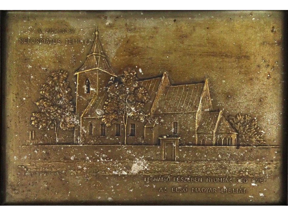 Szép állapotú keretben található, kartonra ragasztott ezüstözött rézlemez dombormű, réz relief. A képen a Vizsolyi Református templom látható. Falra akasztási lehetőséggel rendelkezik.