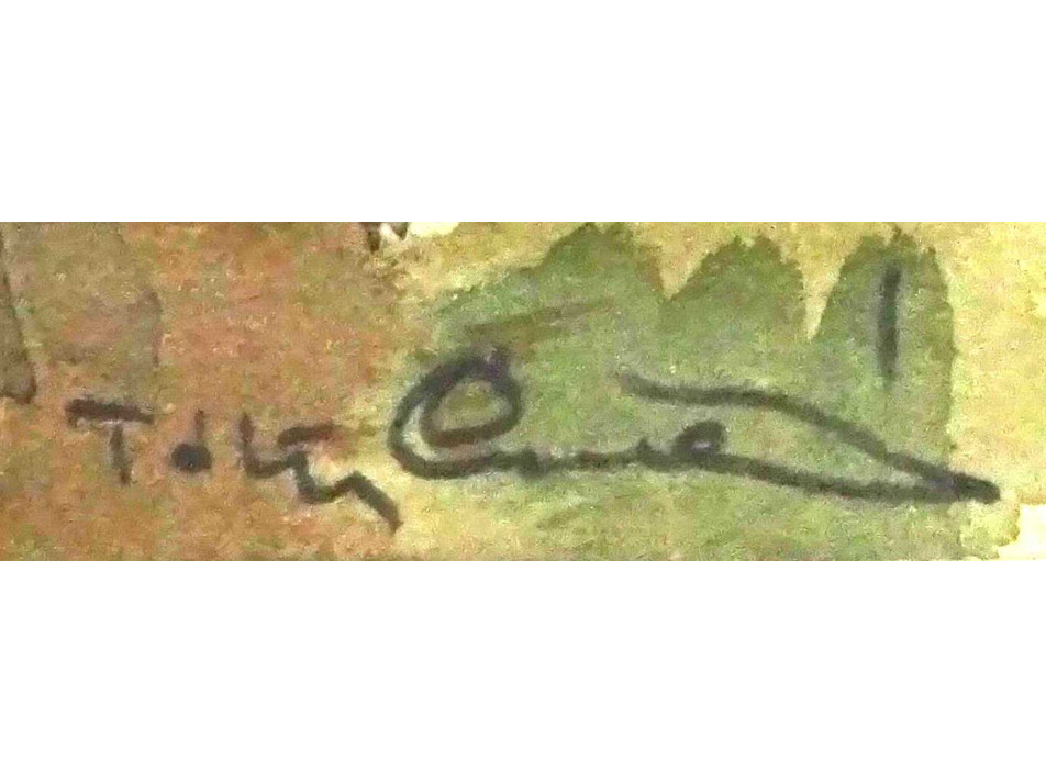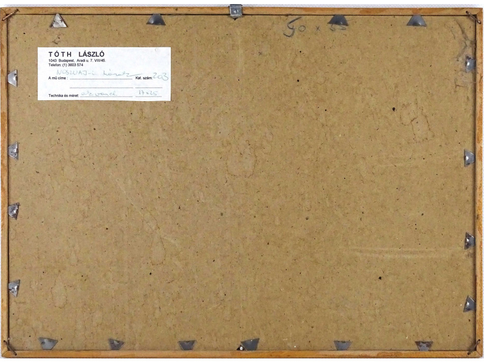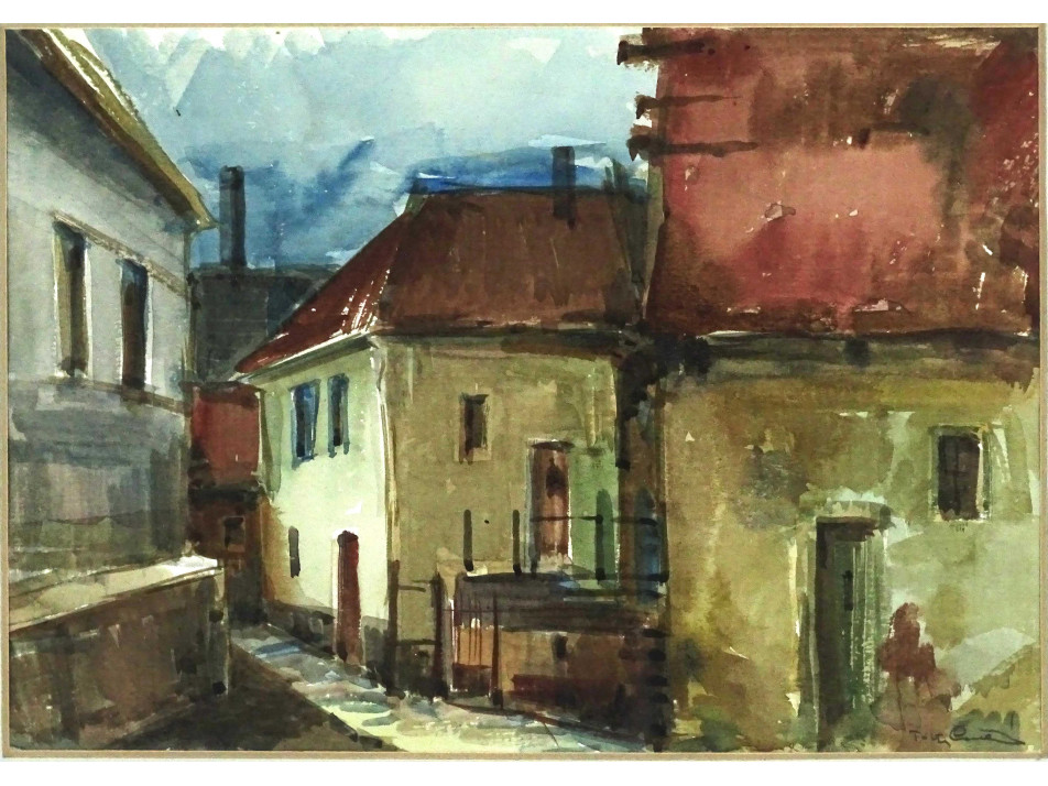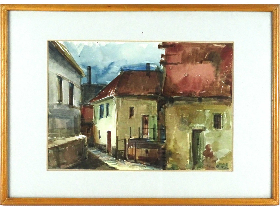 Papír akvarell tájkép, paszpartuban, üveglap mögött, vékony léckeretben.