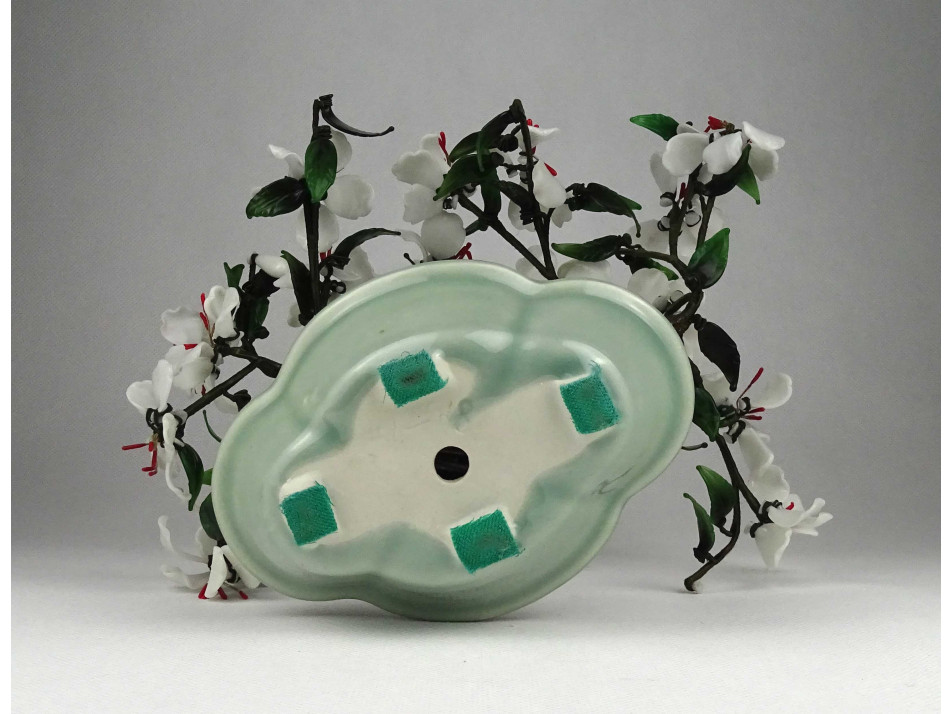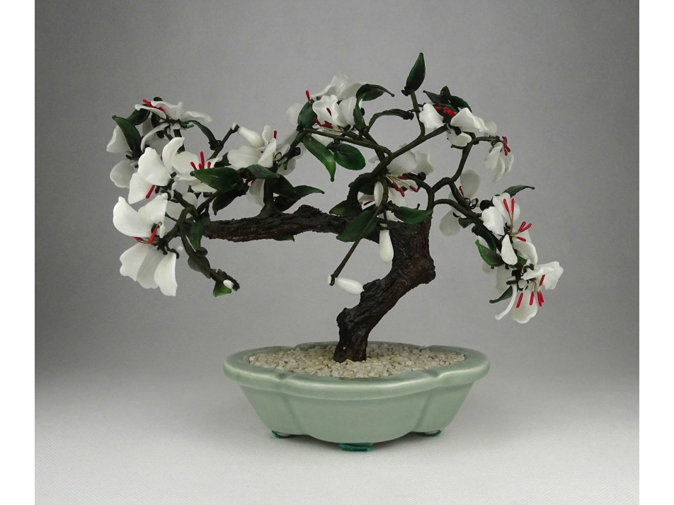Szép állapotú, csiszolt, faragott kőzetekből és üveg szirmokból készült fa dekoráció. A fa tövében található apró dekor kövek rögzítve vannak, nem szóródnak le. Bonsai fa jellegű kőzet fa, lakásdekoráció, lakberendezési tárgy.