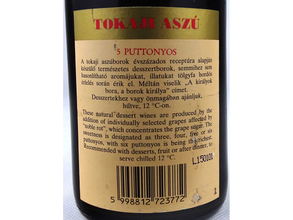 Eredeti, bontatlan Tokaji hat puttonyos aszú bor, 2001-es palackozású.