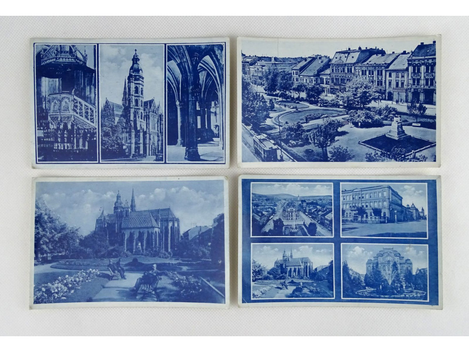 Négy darab régi, szép állapotú képeslap, melyen Kassa látványosságai láthatók.