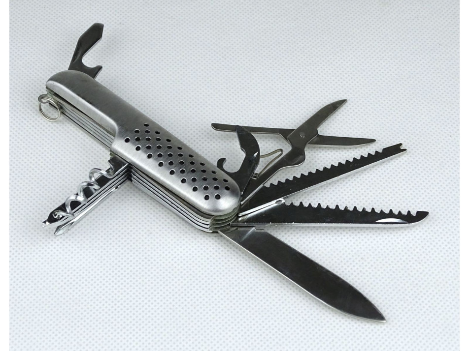 A késen található dugóhúzó, kétféle konzervnyitó, olló, fűrész, reszelő, csavarhúzó és több speciális szerszám.