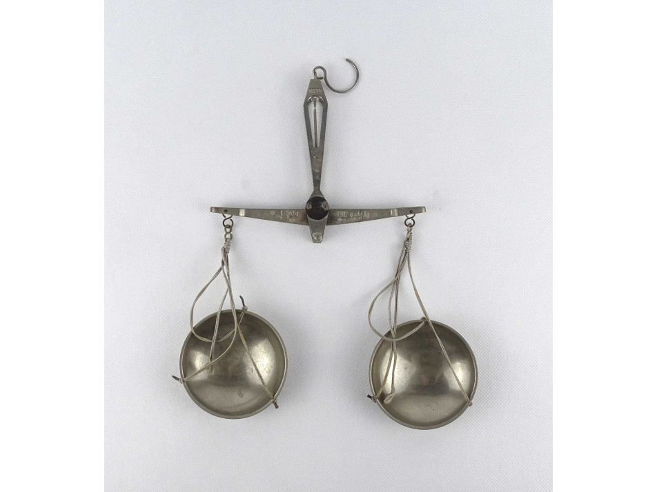 Régi, kétkaros pici mérleg, kis méretű patika mérleg. Akasztóval és fém csészékkel rendelkezik. A karokon számos hitelesító pecsét található