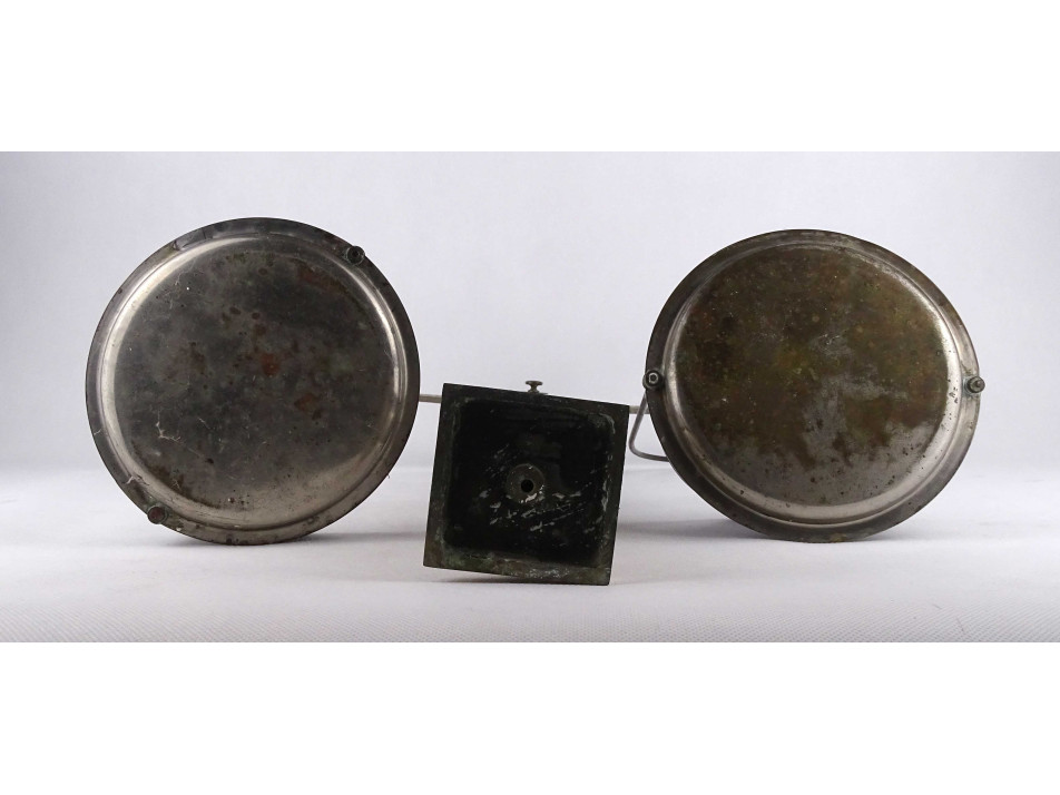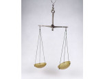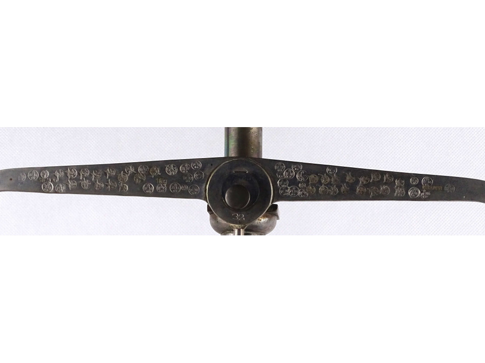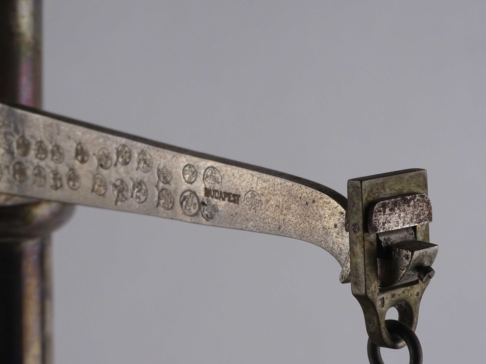 Régi, kétkaros fém szerkezetű gyógyszerész mérleg. A tálcákban fekete műagyag betétek találhatóak. A karokon számos hitelesítő pecsét láthatók. Valószínűleg eredetileg fa talapzaton állhatott. Inkább dísztárgynak, vagy alkatrésznek alkalmas.